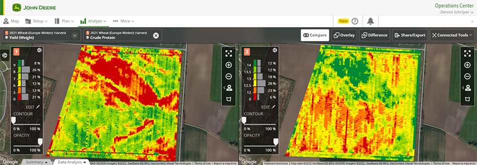 Mapa výnosů a bílkovin (vpravo) zobrazená v Operations Center