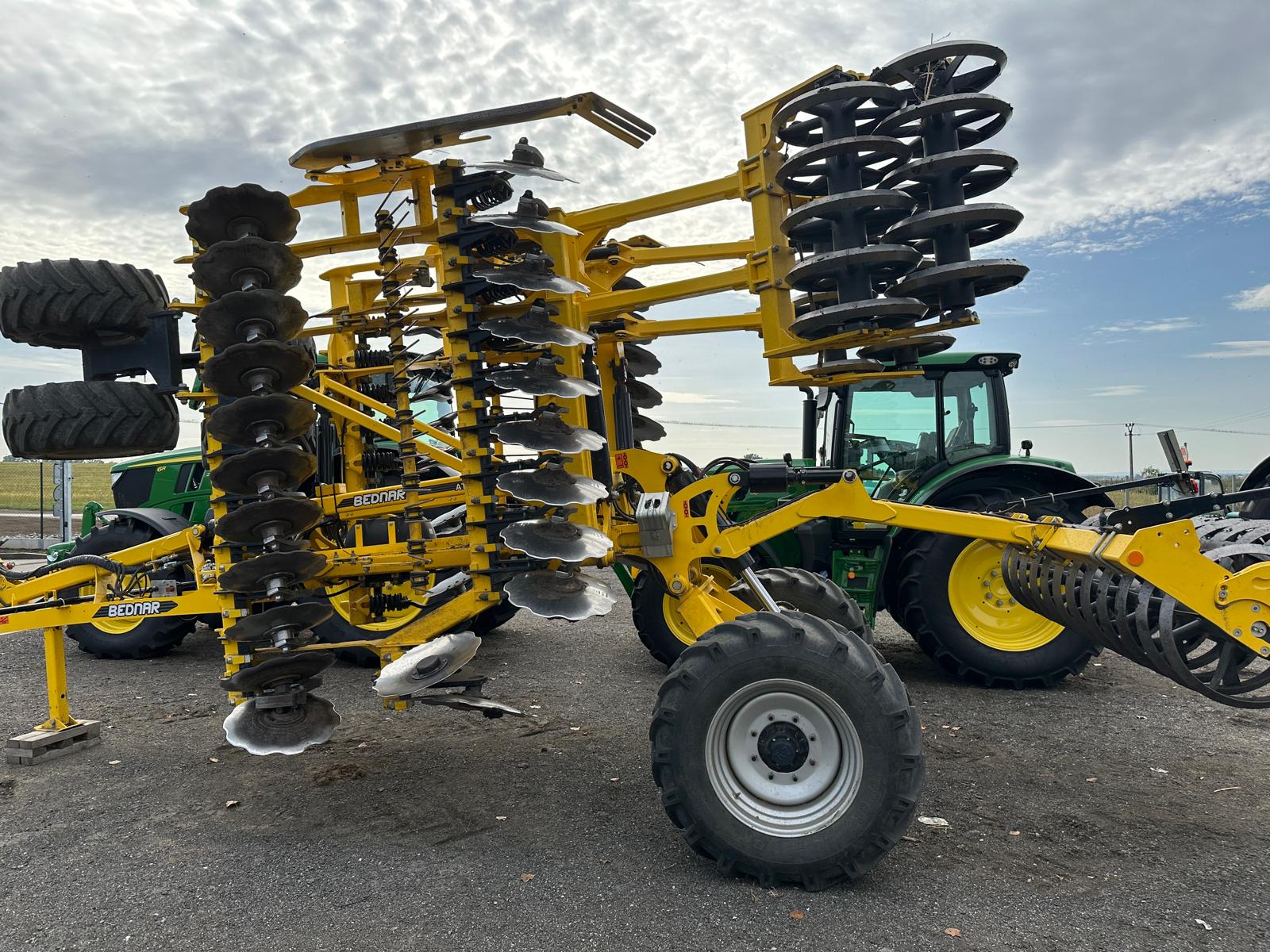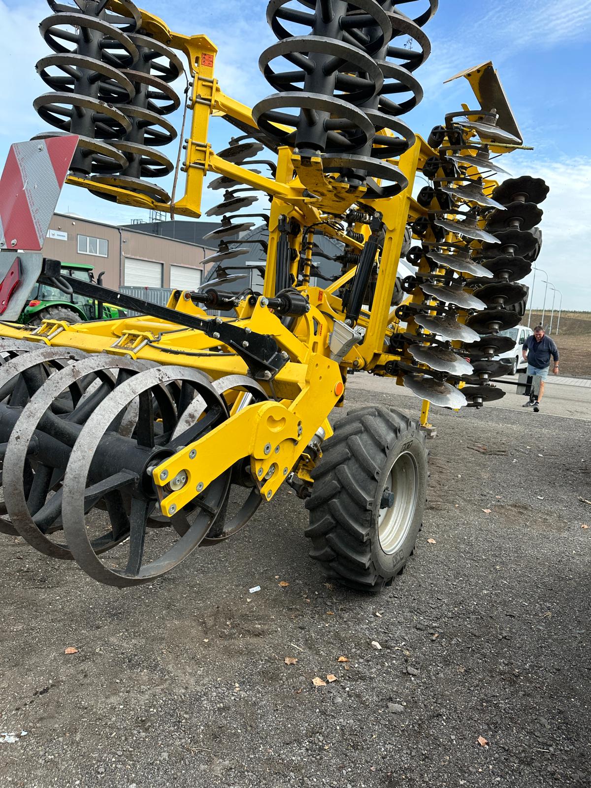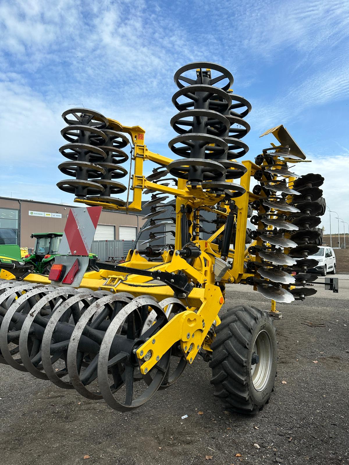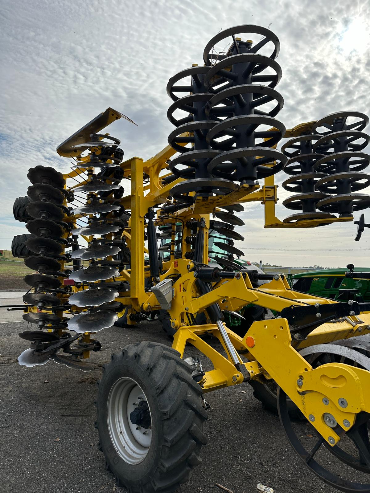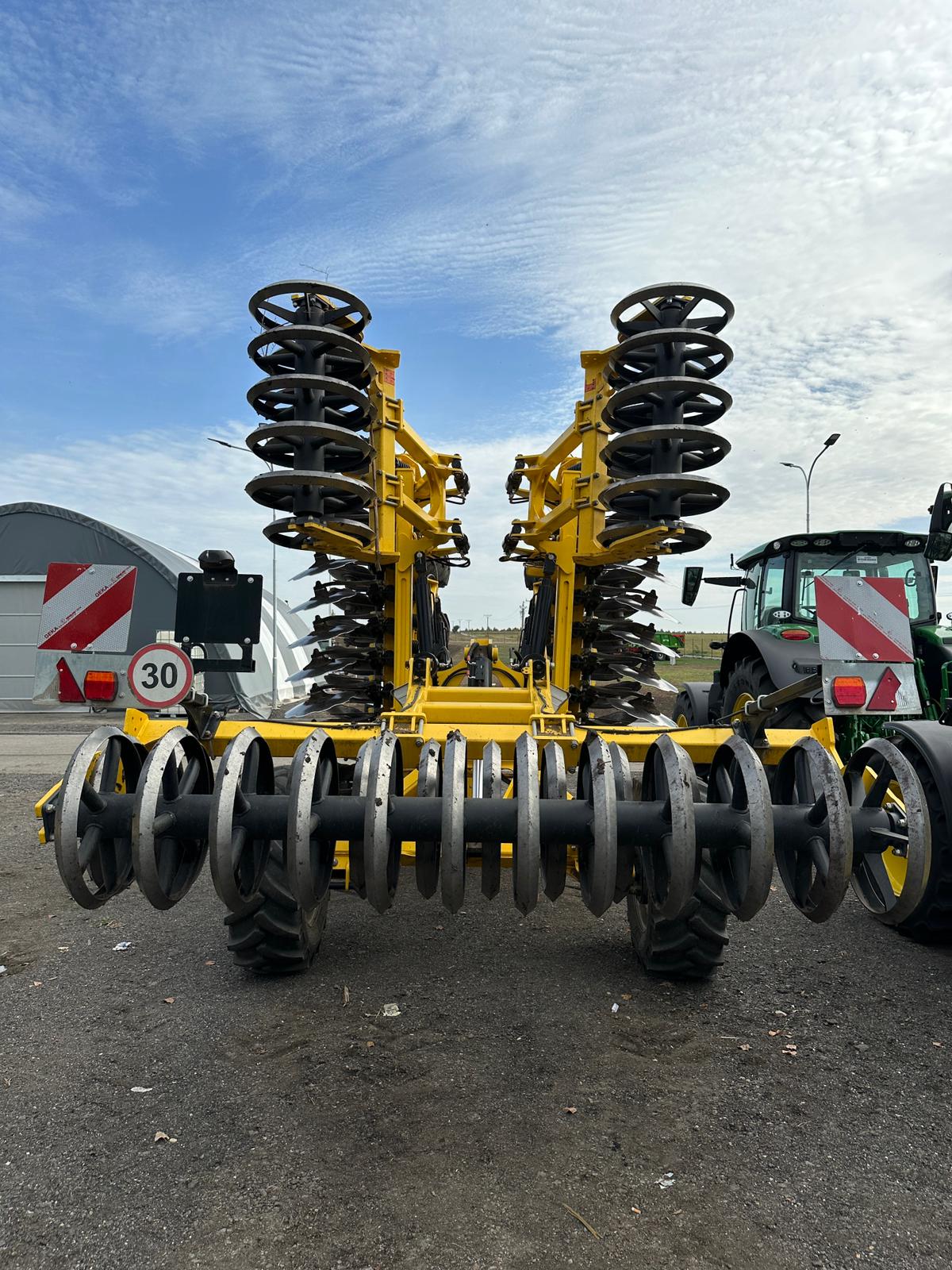 Tažná ok pravítko, DVOJITA PODPERNA KOLA , HYDRAULICKA REGULACE HLOUBKY, prutová drobící sekce mezi disky, BOCNI CLONY TELESKOP , bržděná náprava, Dvojitý V-ring pěch 630 mm, OSVETLENI (AO) EU, KOVOVA MADLA HYDR. HADIC
