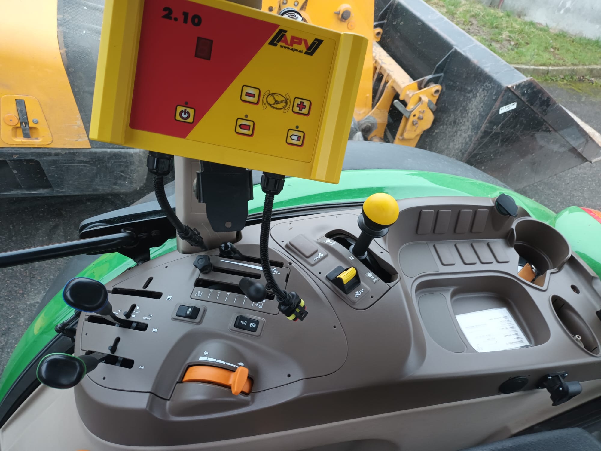 Česká verze traktoru, POWER REVERSER 16/16, pneumatiky: 420/85R34+13.6-24, panoramatická střecha, klima, vzduchové brzdy 2+1, závěs, skříňka na nářadí, sedačka spolujezdce, maják, vypínač baterie.