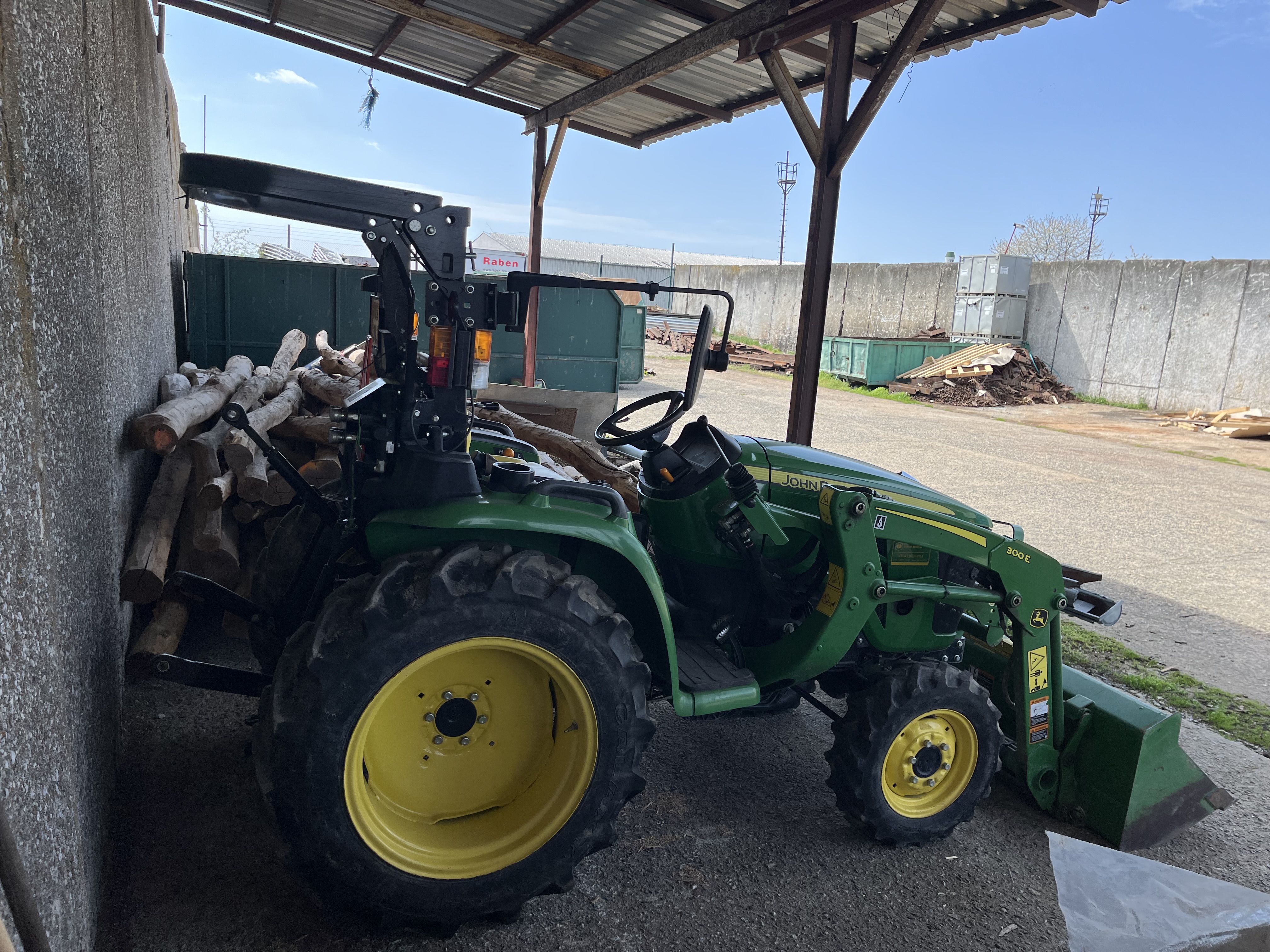 John Deere 3038E včetně čelního nakladače, lopaty a paletizačních vidlí.