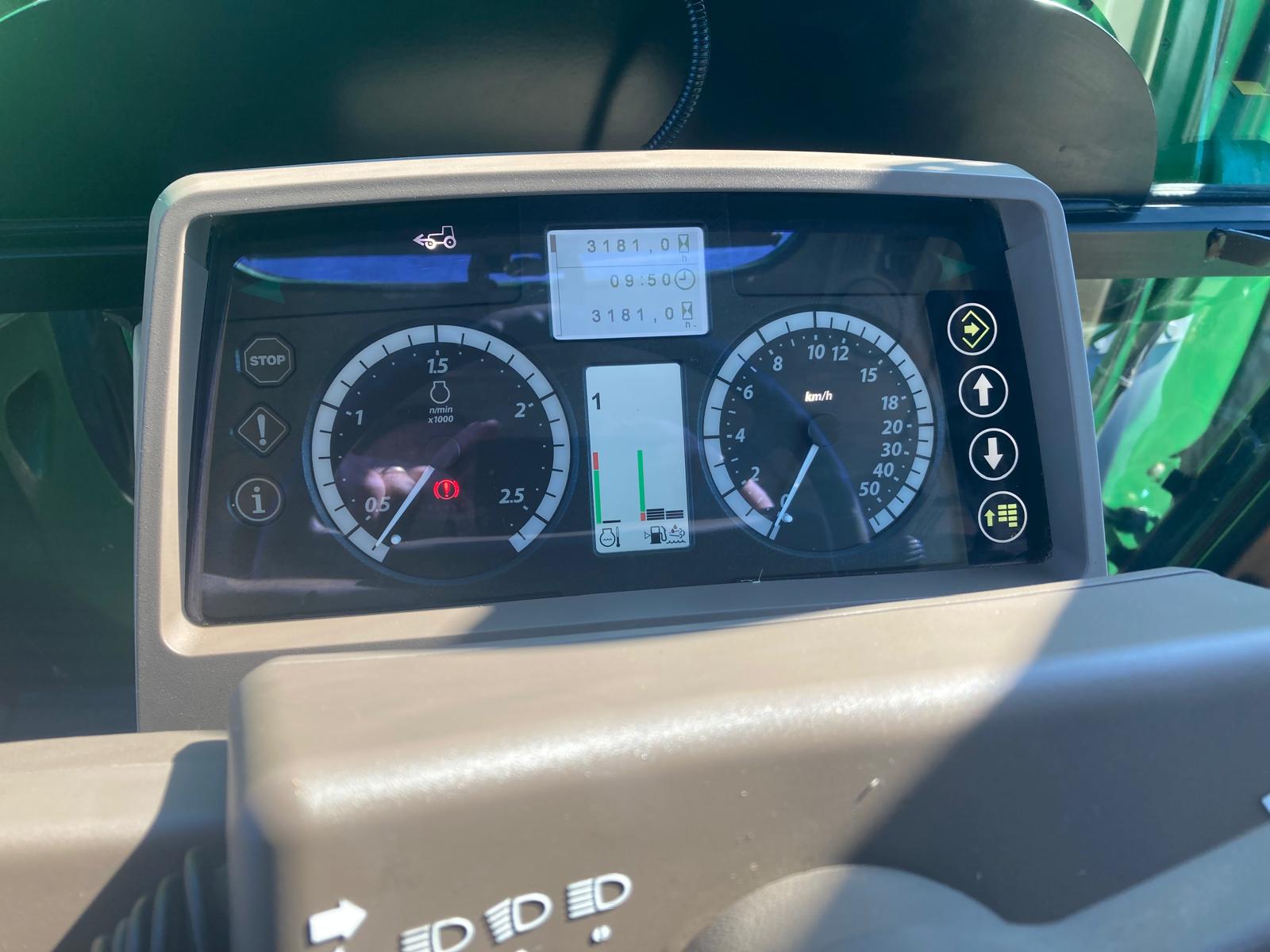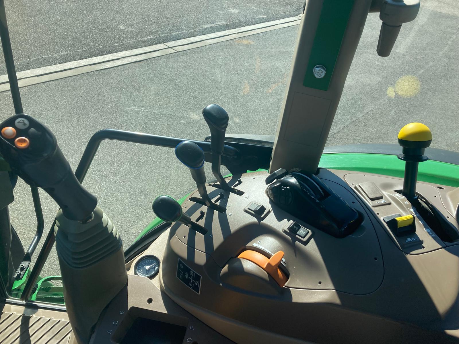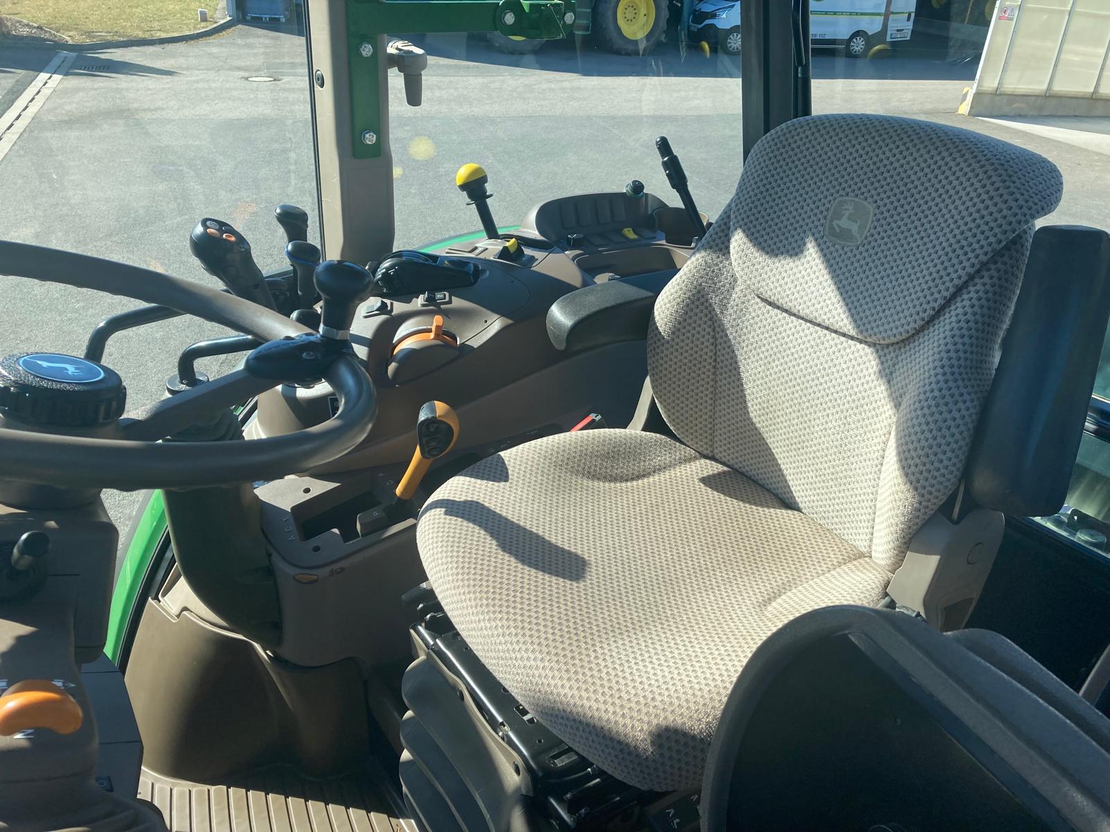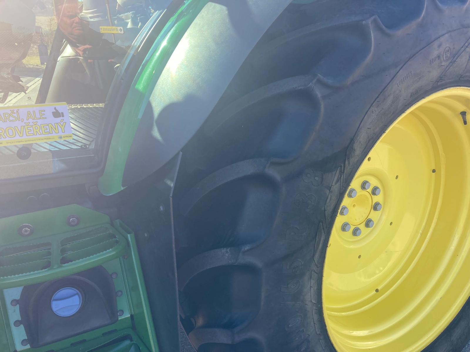 rok výroby 2018, do provozu 22.3. 2019, jmenovitý výkon motoru 95 PS, maximální 100 PS, najeto 3181 mth, odpružená přední náprava TLS, převodovka PowrQuad Plus 24/24 (4 rychlost pod zatížením řazené v 6 skupinách, el. reverz), vývodový hřídel 540/540E/1000 ot./min, zadní závěs s automatickou hubicí, vzduchové brzdy dvouhadicové, 3 hydraulické okruhy, sedačka spolujezdce, klimatizace, pneu přední 480/65R24 - 40% vzorku, zadní 540/65R38 - 40% vzorku, otočné blatníky, skříňka na nářadí, střešní okno, čelní nakladač John Deere 603R, kryt čelní masky
