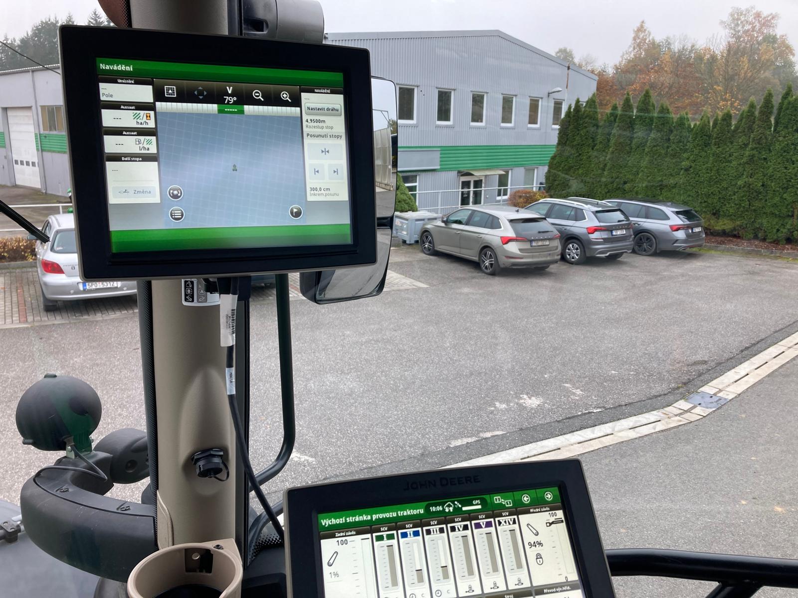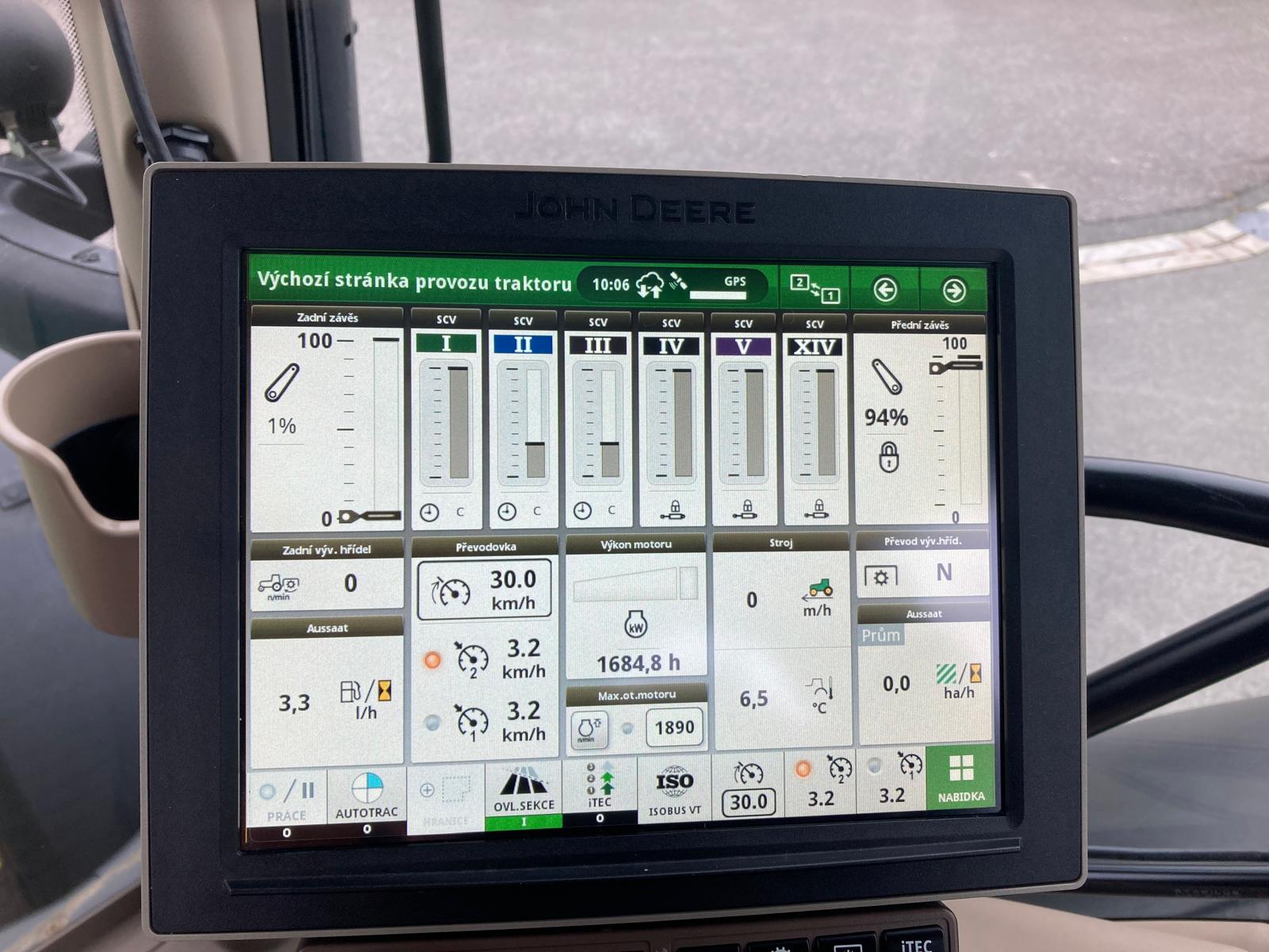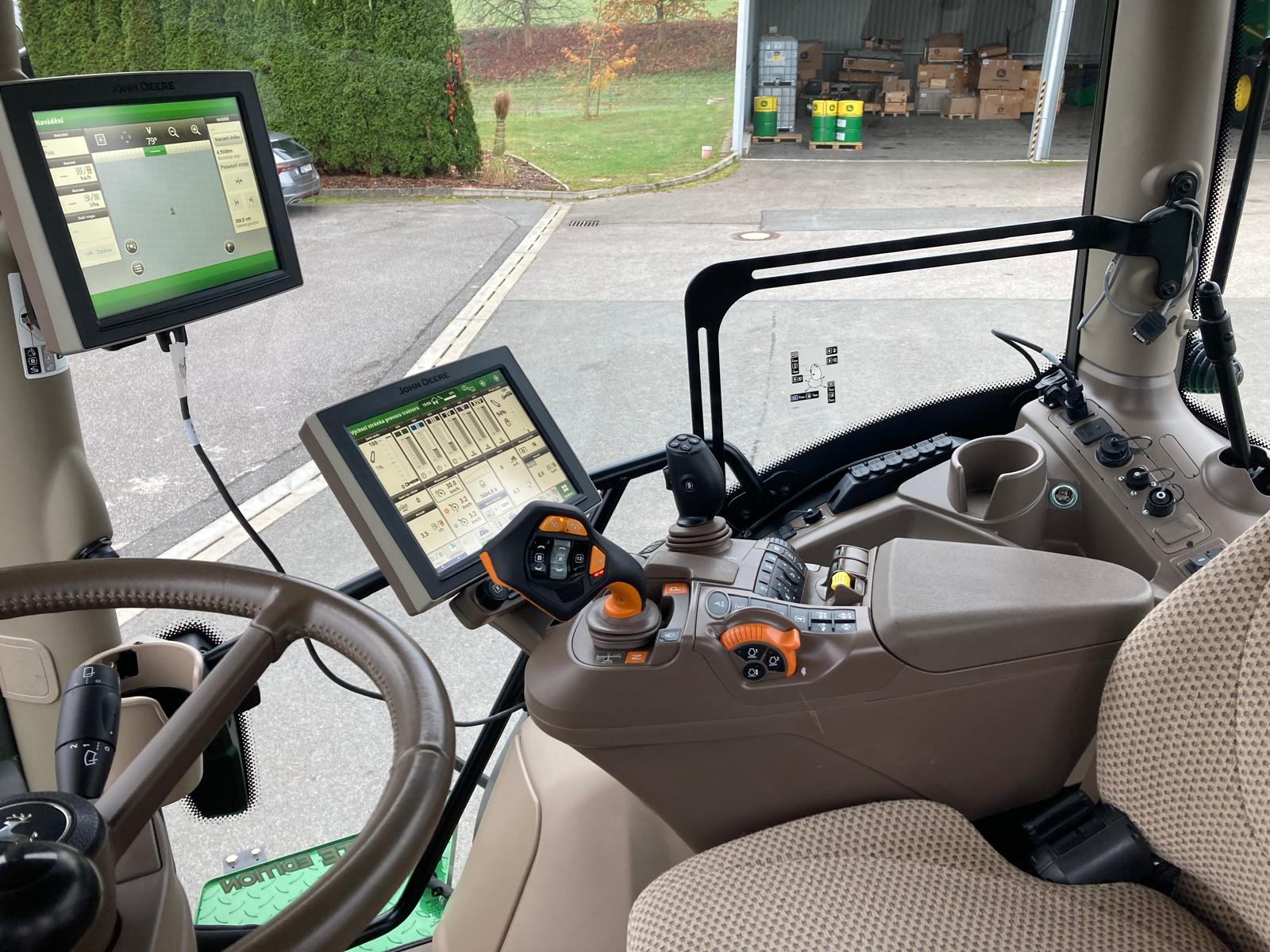 Výroba 3/2020, do provozu 9/2020, originální jmenovitý výkon motoru 250 PS, maximální 275 PS, jmenovitý s navýšením IPM 290 PS, najeto 1685 mth, edice Ultimate, odpružená přední náprava TLS s brzdami, odpružená kabina, plynulá převodovka AutoPowr s ovládáním CommandPro, vývodový hřídel 540/1000E/1000 ot./min, zadní závěs s automatickou hubicí + K80, 5 hydraulických okruhů elektricky ovládaných + joystick, souvraťová automatika iTEC, AutoTrak příprava a aktivace včetně sekční kontroly a automatického otáčení na souvrati a synchronizace strojů, přijímač SF6000/SF1 s aktivací na SF3 a mRTK, display 4600 (10“) a rozšiřující monitor, pneu Michelin - přední 600/70R30 80% , zadní 710/70R42 – 80%, centrální regulace tlaku v pneu, otočné přední blatníky, automatická klimatizace, sedačka řidiče v provedení Ultimate (vyhřívání, aktivní ventilace), sedačka spolujezdce, chladnička, čelní hydraulika premium, variabilní řízení, LED pracovní osvětlení, vzduchové brzdy 2 hadicové, imobilizér, aktivovaný JD link, 100% uzávěrka přední nápravy, kůží potažený volant, střešní okno, hydraulický třetí bod. Na motorové brzdě naměřen jmenovitý výkon na PTO (bez navýšení IPM) 162,1 kW.