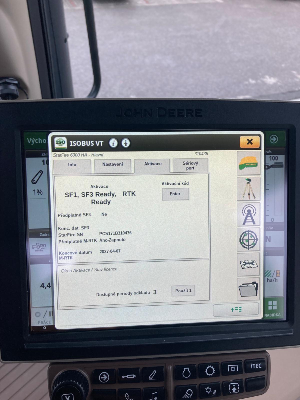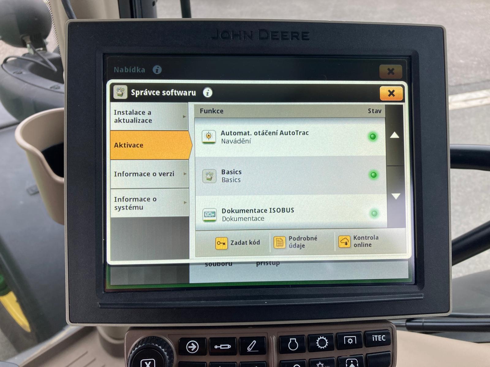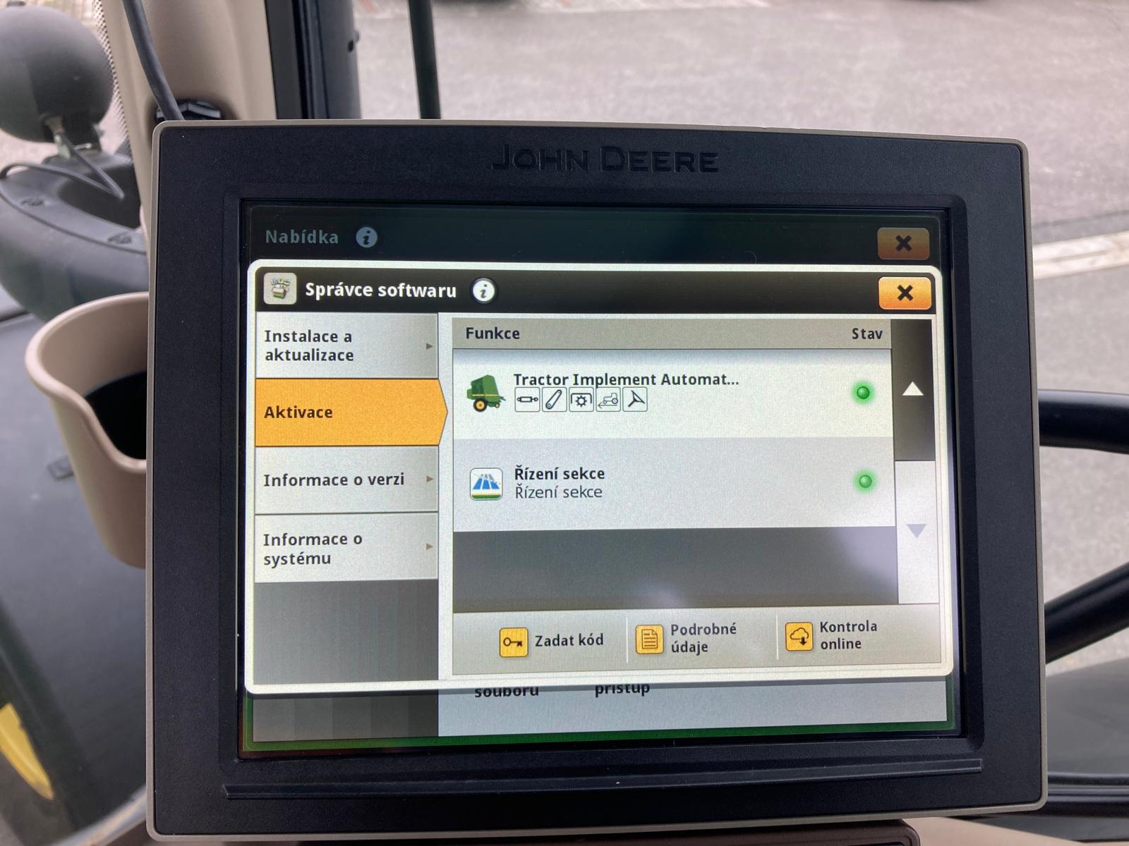 Výroba 3/2020, do provozu 9/2020, originální jmenovitý výkon motoru 250 PS, maximální 275 PS, jmenovitý s navýšením IPM 290 PS, najeto 1685 mth, edice Ultimate, odpružená přední náprava TLS s brzdami, odpružená kabina, plynulá převodovka AutoPowr s ovládáním CommandPro, vývodový hřídel 540/1000E/1000 ot./min, zadní závěs s automatickou hubicí + K80, 5 hydraulických okruhů elektricky ovládaných + joystick, souvraťová automatika iTEC, AutoTrak příprava a aktivace včetně sekční kontroly a automatického otáčení na souvrati a synchronizace strojů, přijímač SF6000/SF1 s aktivací na SF3 a mRTK, display 4600 (10“) a rozšiřující monitor, pneu Michelin - přední 600/70R30 80% , zadní 710/70R42 – 80%, centrální regulace tlaku v pneu, otočné přední blatníky, automatická klimatizace, sedačka řidiče v provedení Ultimate (vyhřívání, aktivní ventilace), sedačka spolujezdce, chladnička, čelní hydraulika premium, variabilní řízení, LED pracovní osvětlení, vzduchové brzdy 2 hadicové, imobilizér, aktivovaný JD link, 100% uzávěrka přední nápravy, kůží potažený volant, střešní okno, hydraulický třetí bod. Na motorové brzdě naměřen jmenovitý výkon na PTO (bez navýšení IPM) 162,1 kW.