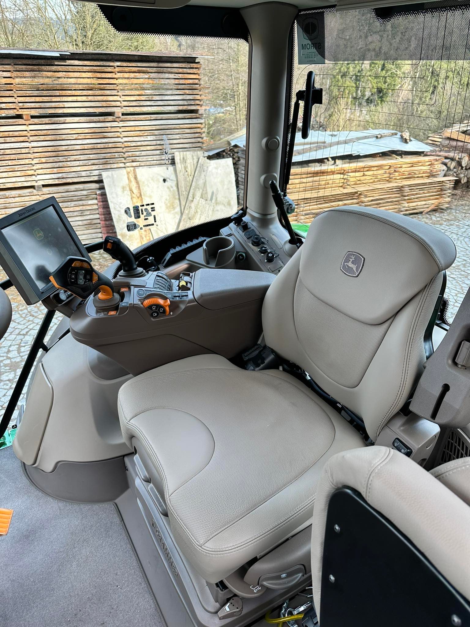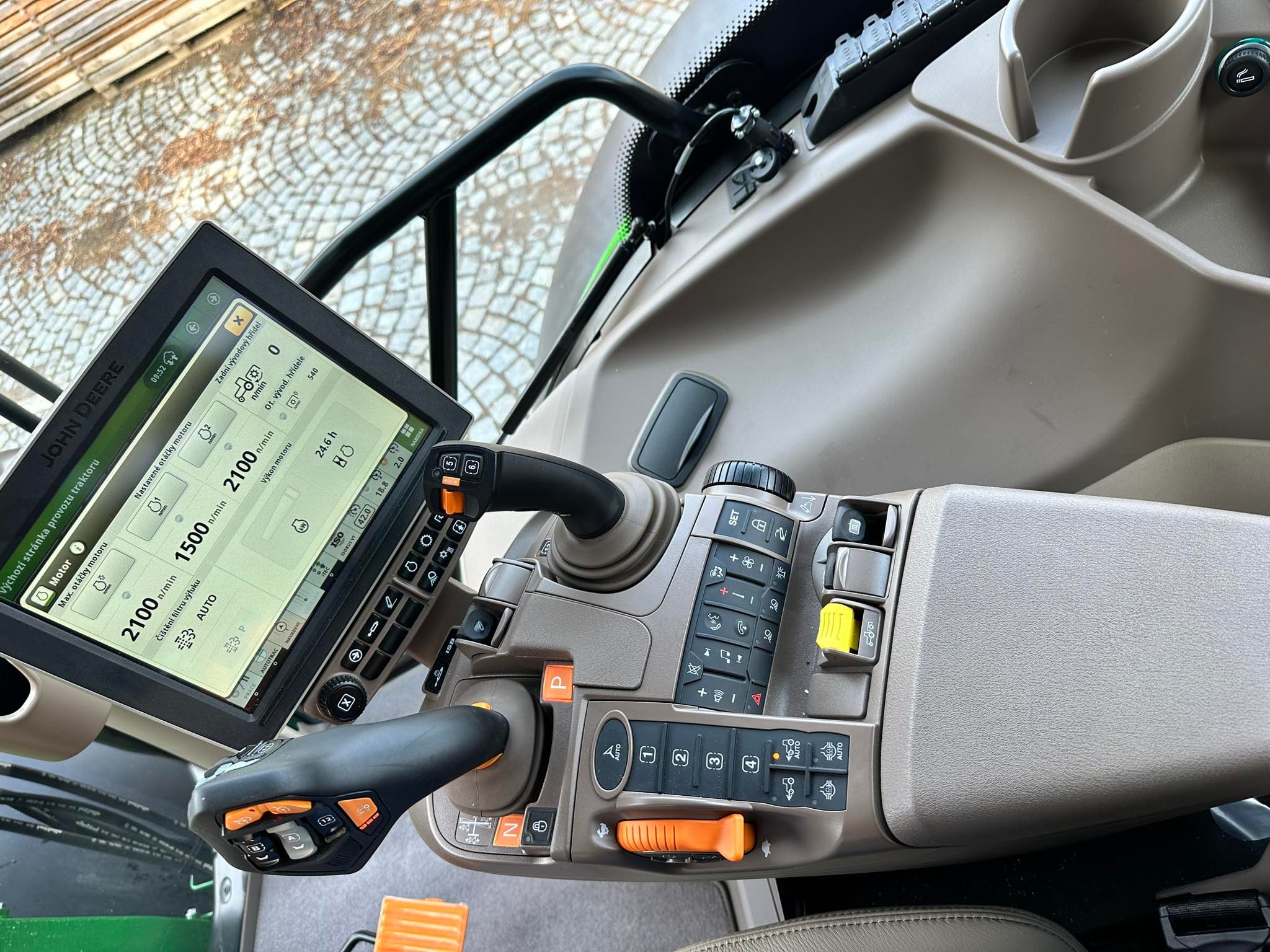 Převodovka AutoPowr s CommandPRO, display v opěrce s úhlopříčkou 10", sedačka Ultimate Grammer s aktivní ventilací, kožený potah sedaček, koberec na podlaze, zpětná zrcátka elektricky stavitelná dlouhá vysunovací manuálně, pracovní světlomety ve střeše, vpředu 6, vzadu 4, vzadu na boku 2, vzadu na blatníku vše v LED, zadní okno kabiny vyhřívané, panoramatické dveře, 4 sloupková kabina, přední okno vcelku, rádio Premium: 4 reproduktory, AM/FM/DAB+ stereo, USB, Bluetooth handsfree s mikrofonem, čerpadlo hydrauliky 114 l/min, 3 elektrické SCV - Premium, příprava pro čelní nakladač 2funkce a dělič E-ICV, včetně el. joysticku, příprava volné zpátečky, bez koncovek, navýšení výkonu IPM i pro hydrauliku, nutné zvolit u 6R 165 a 6R 185, zadní vývodový hříde 540 / 540E / 1000 ot/min, přední náprava odpružená TLS, kabina odpružená s automatickou klimatizací, vzduchové brzdy systém 2 hadice, pneumatiky zadní 710/70R38, přední 600/65R28 Firestone, Imobilizér v klíčku, nelze deaktivovat, nerezový kryt výfuku, vypínač baterie elektronický, závěs automat 8 poloh čep 38mm + K80, chladnička na blatníku, JD link, AutoTrac příprava