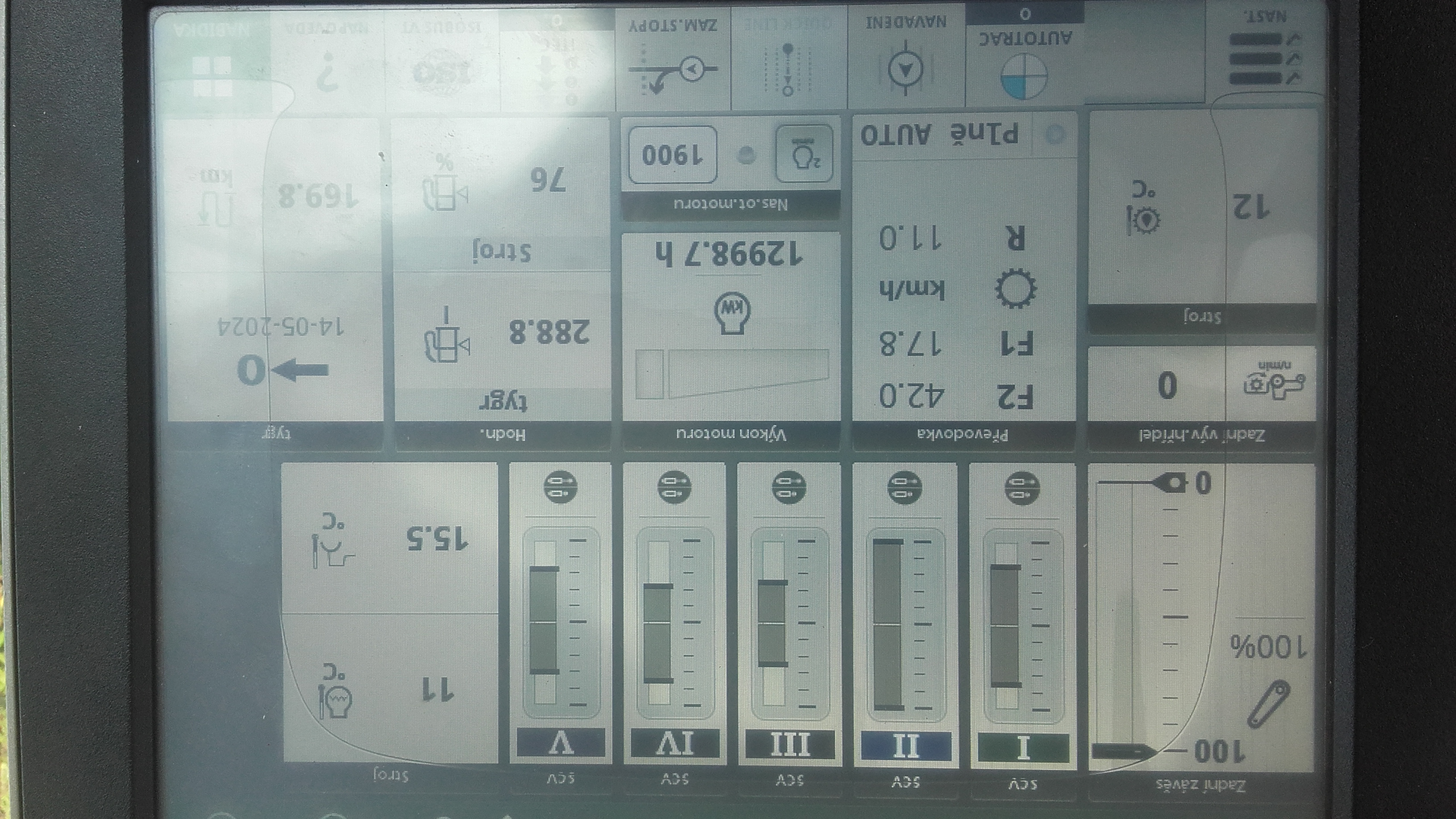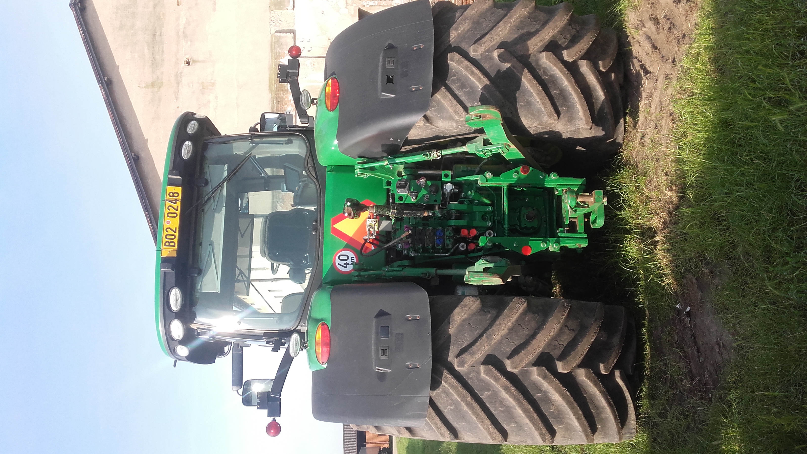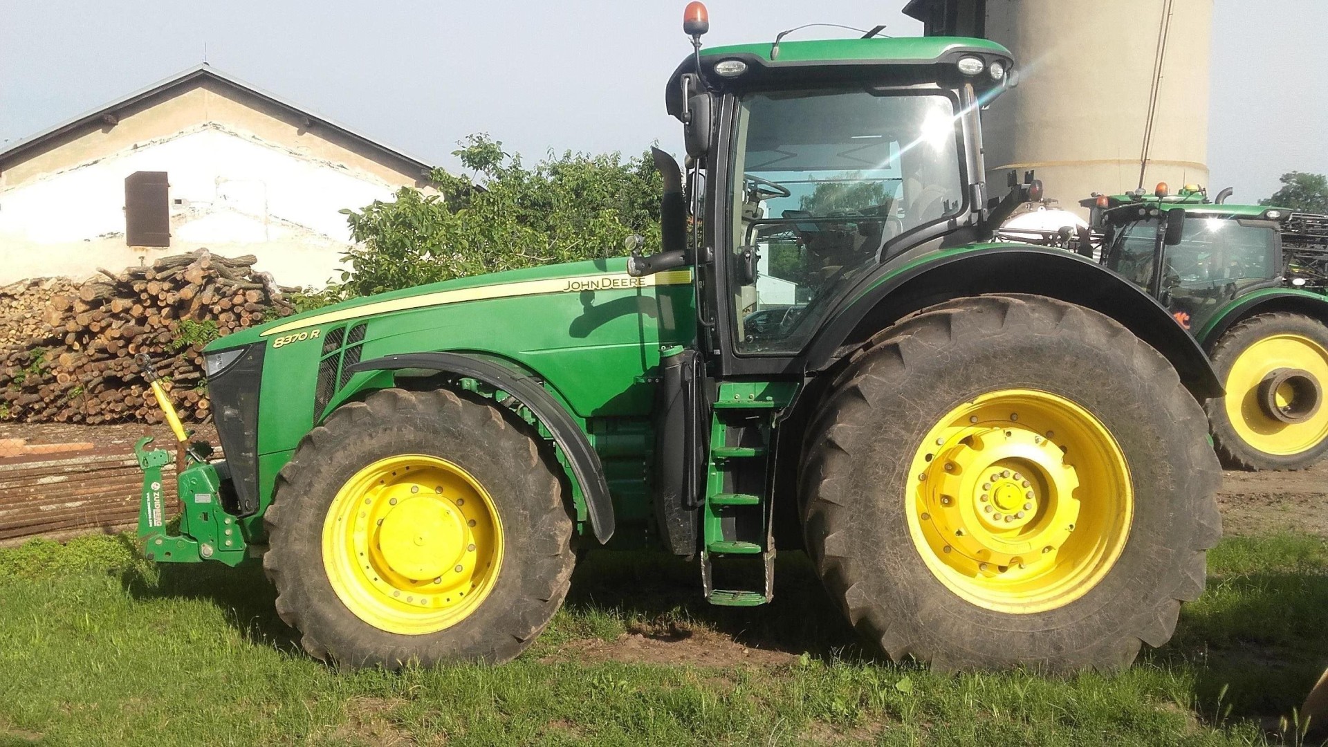 JD 8370R AP, r.v. 2015, 12999 mth, čelní hydraulika 5t, 5 hydr. okruhů + LS, horní závěs, spodní tažná tyč, plato K80 s naváděním K50, pneu přední IF 650/60R34 BKT cca 4cm vzorek, pneu zadní IF 900/60R42 BKT cca 5cm vzorek, (oprava motoru v r. 2020 při 8200 mth)