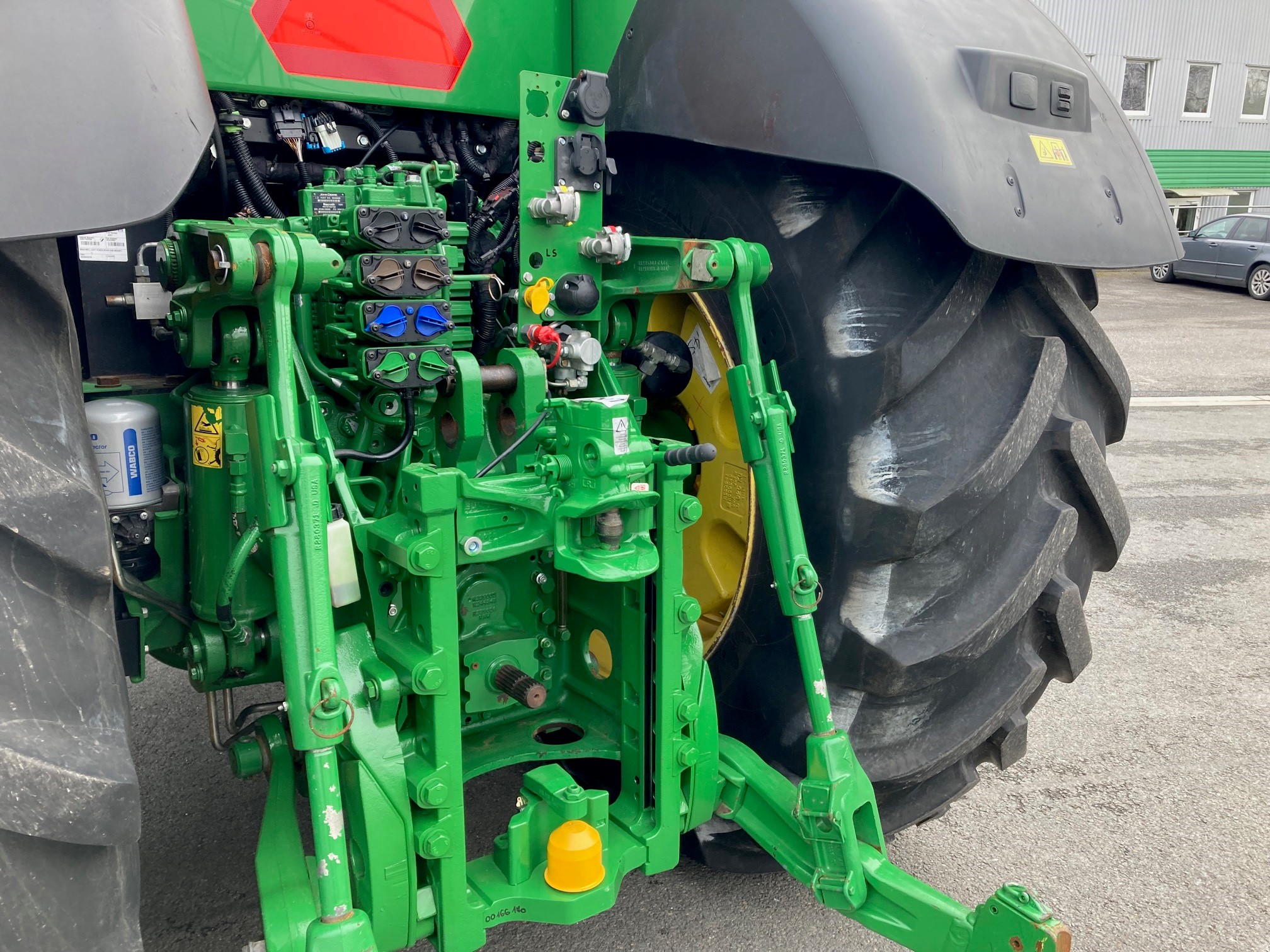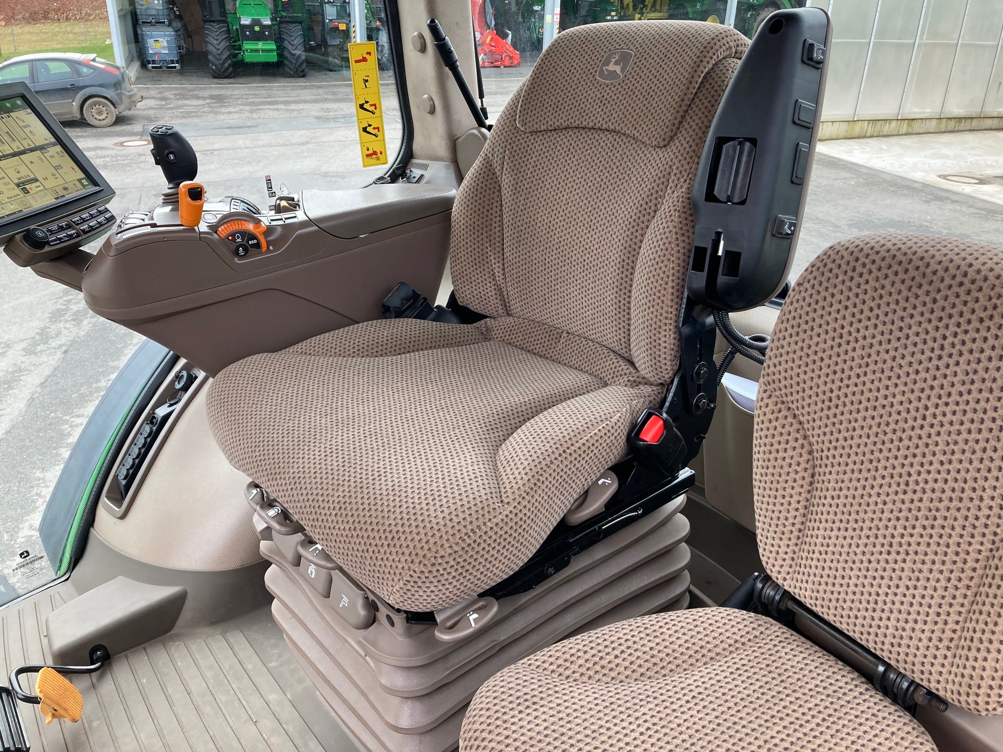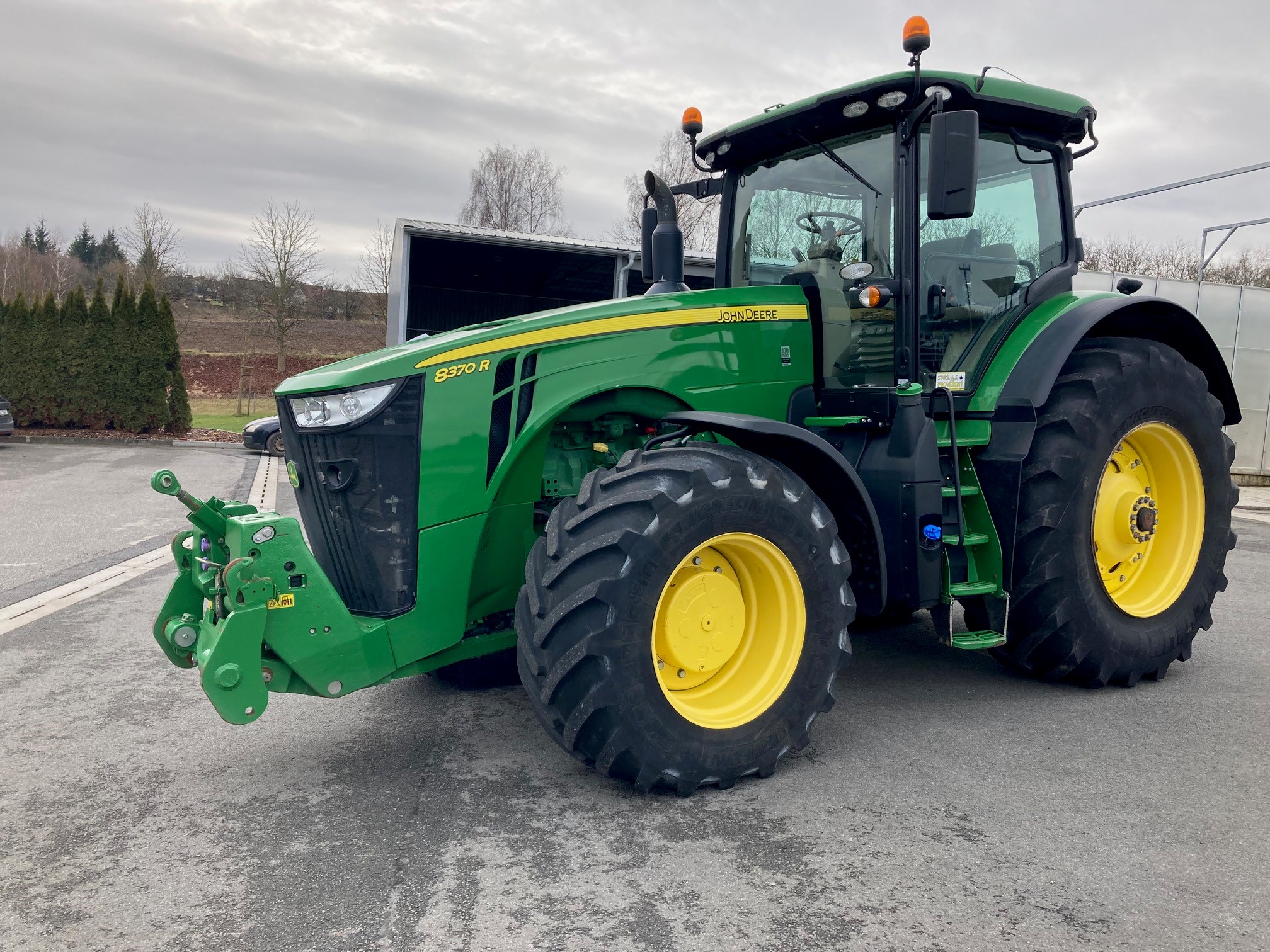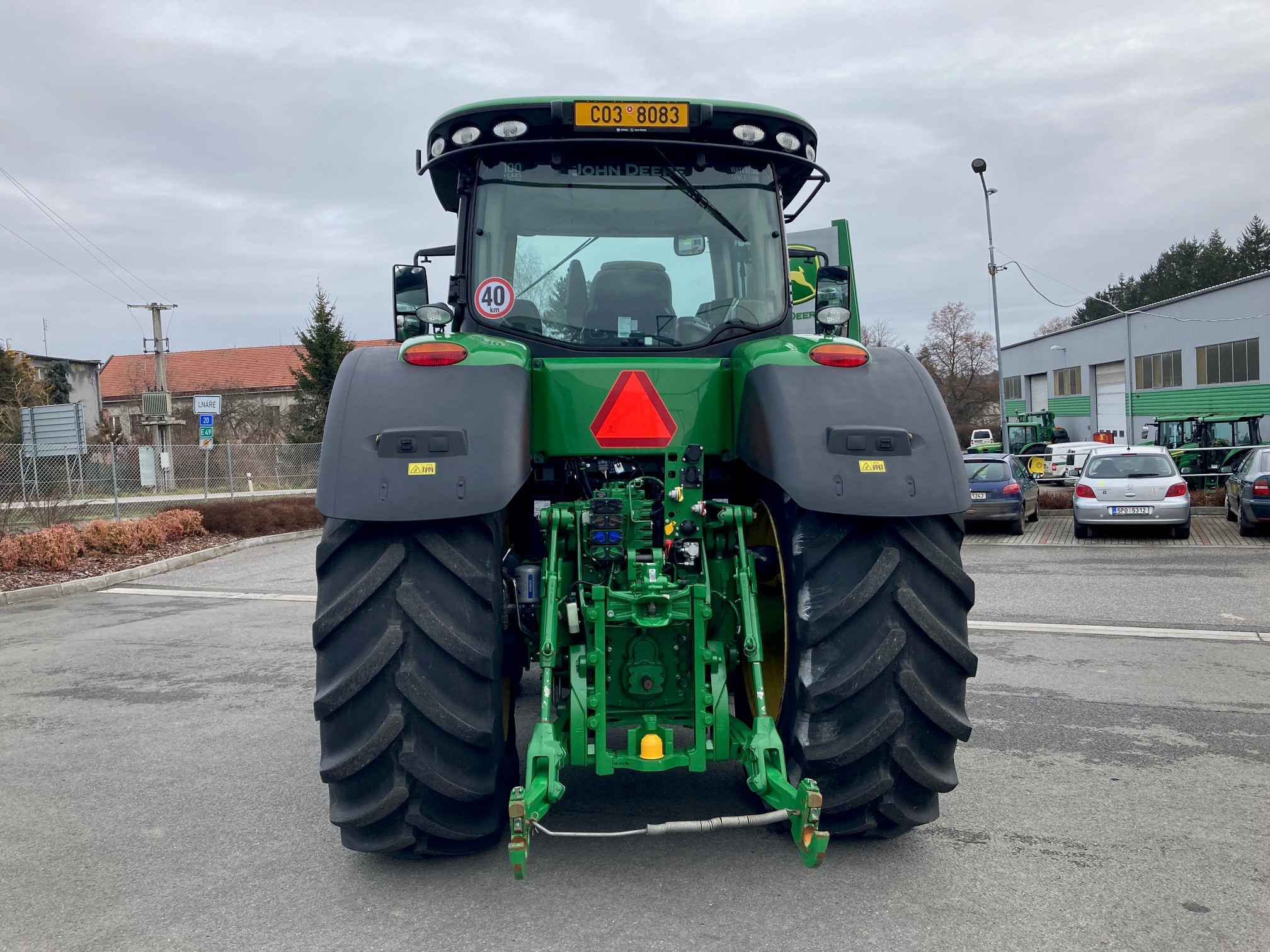 Rok výroby 6/2018, do provozu 26. 9. 2018, jmenovitý výkon motoru 370 PS, jmenovitý výkon s navýšením IPM - 420 PS, maximální výkon motoru bez navýšení 407 PS, plynulá převodovka Autopowr, odpružená přední náprava, aktivní sedačka, výškově stavitelný závěs s automatickou hubicí + K80, vzduchové brzdy dvouhadicové, závaží v zadních kolech 625 kg, čelní hydraulika, automatická klimatizace, procesor 4100, display 10“, 4 hydraulické okruhy + el. joystick, PTO 1000 ot., Nové pneumatiky BKT 600/70 R30 + 710/75R42, AutoTrak příprava+ aktivace, skříňka na nářadí, imobilizer, vypínač baterie, rádio premium, aktivovaný JD link,
