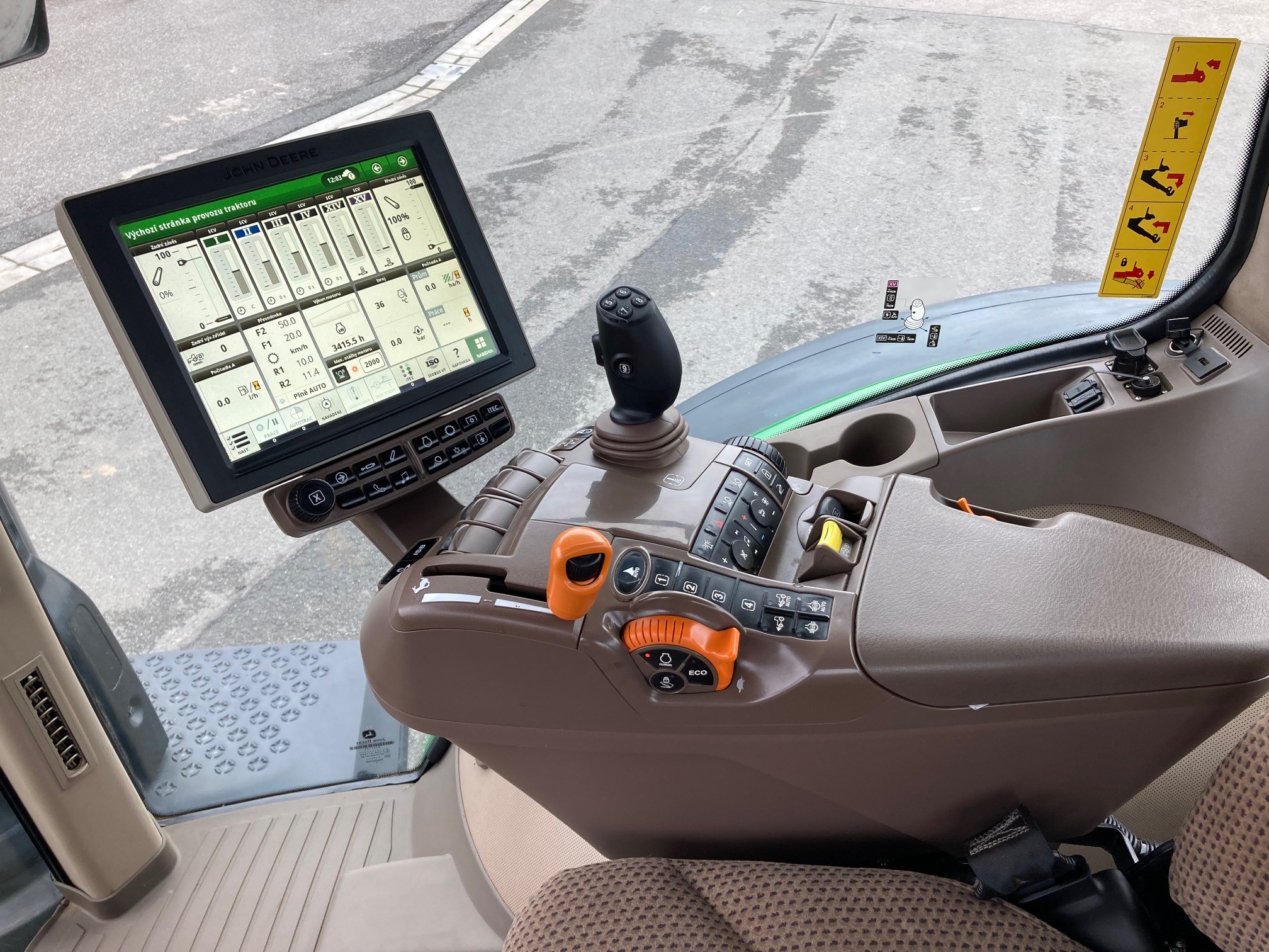 Rok výroby 6/2018, do provozu 26. 9. 2018, jmenovitý výkon motoru 370 PS, jmenovitý výkon s navýšením IPM - 420 PS, maximální výkon motoru bez navýšení 407 PS, plynulá převodovka Autopowr, odpružená přední náprava, aktivní sedačka, výškově stavitelný závěs s automatickou hubicí + K80, vzduchové brzdy dvouhadicové, závaží v zadních kolech 625 kg, čelní hydraulika, automatická klimatizace, procesor 4100, display 10“, 4 hydraulické okruhy + el. joystick, PTO 1000 ot., Nové pneumatiky BKT 600/70 R30 + 710/75R42 – 95%, AutoTrak příprava+ aktivace, skříňka na nářadí, imobilizer, vypínač baterie, rádio premium, aktivovaný JD link,