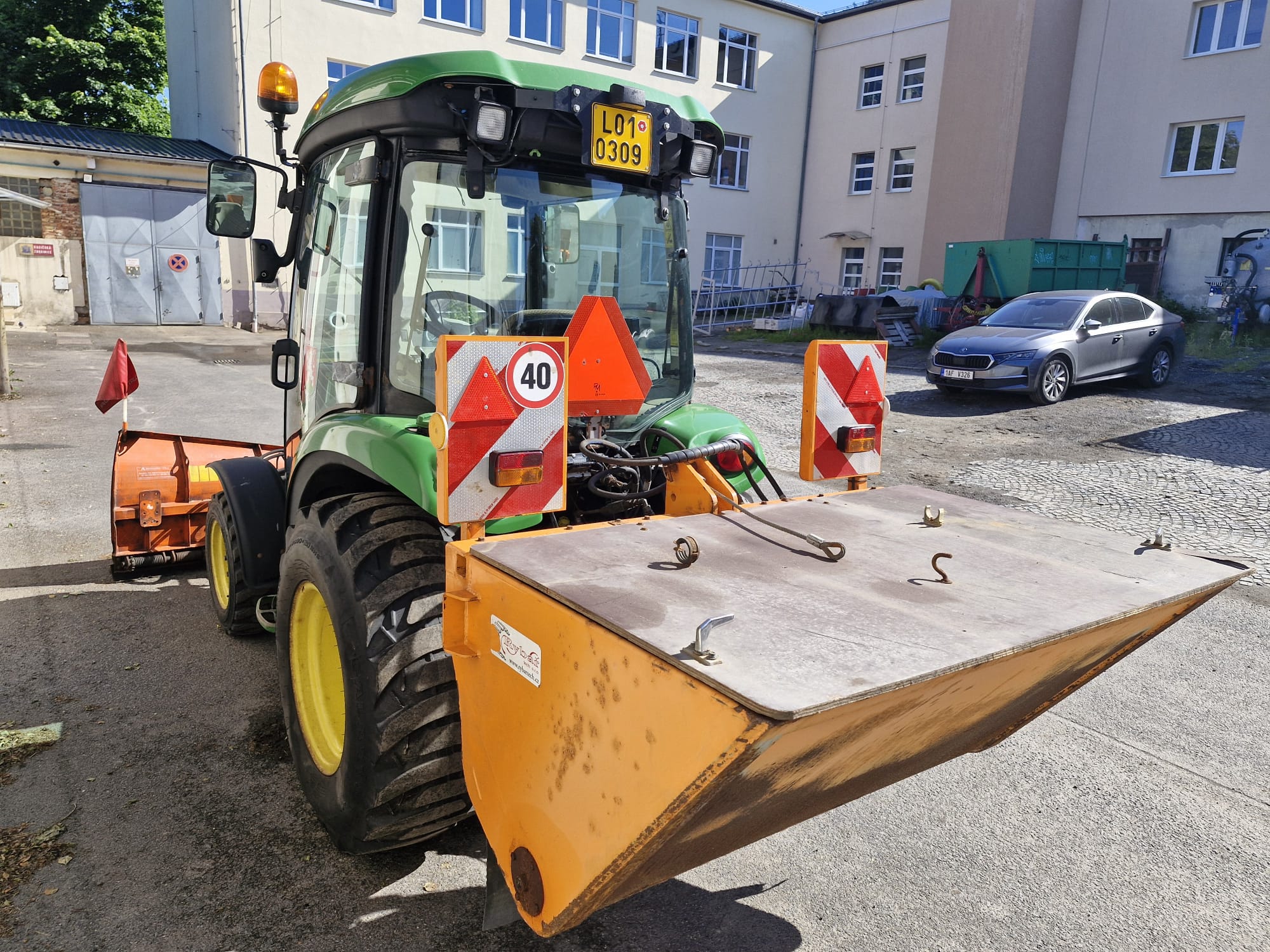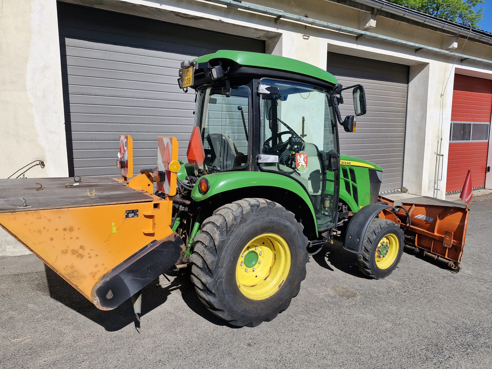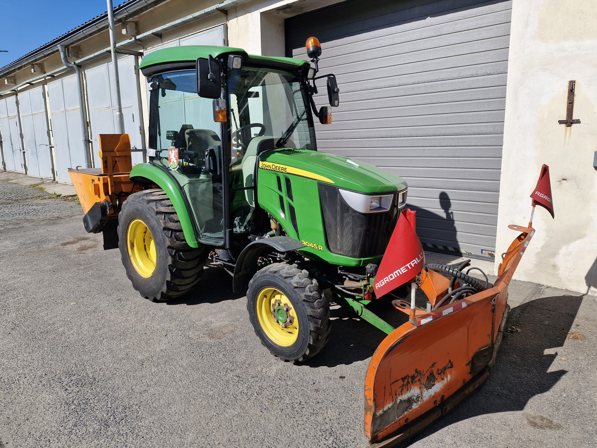 V ceně stroje je i čelní šípová radlice a zadní sypač