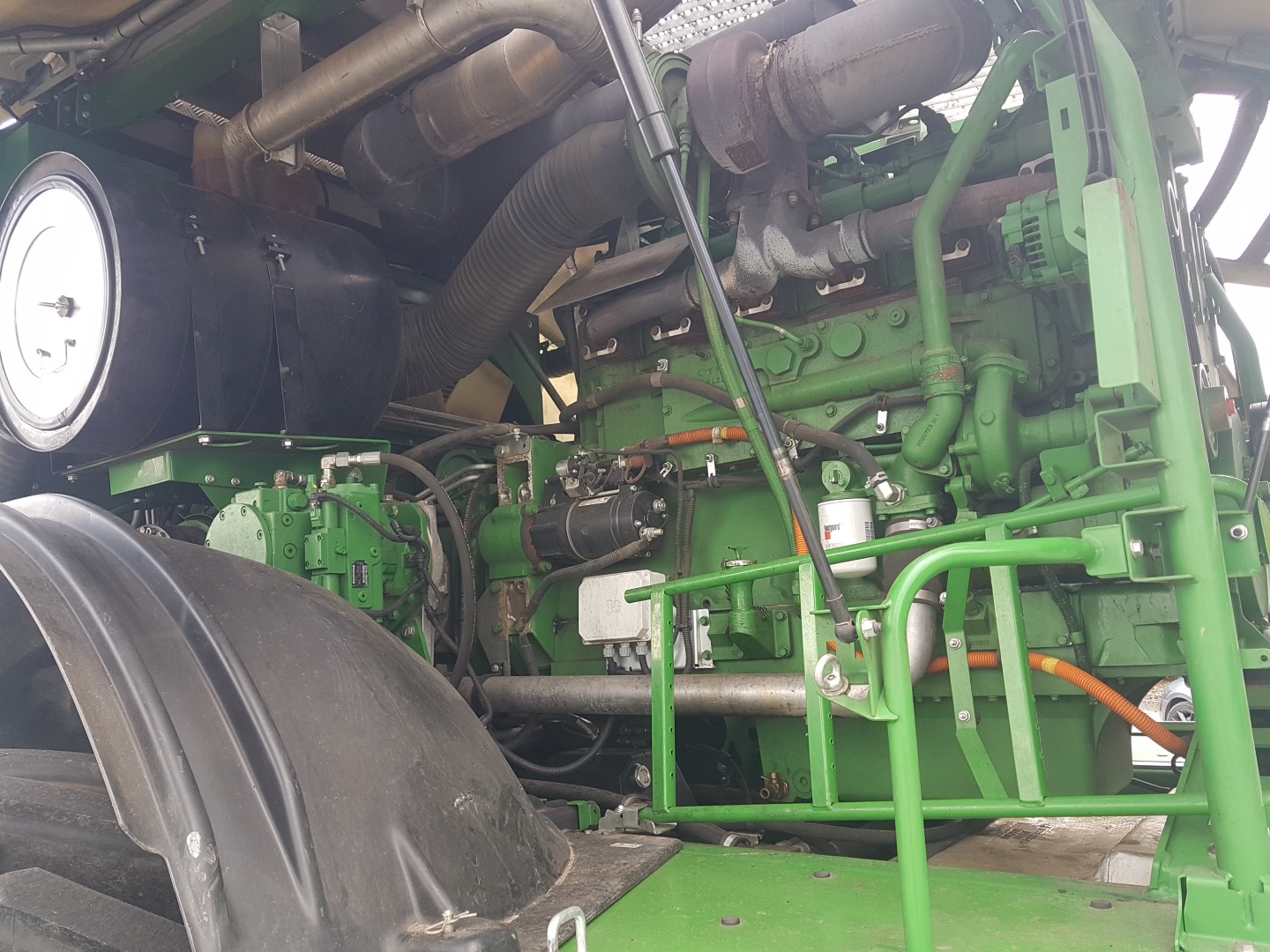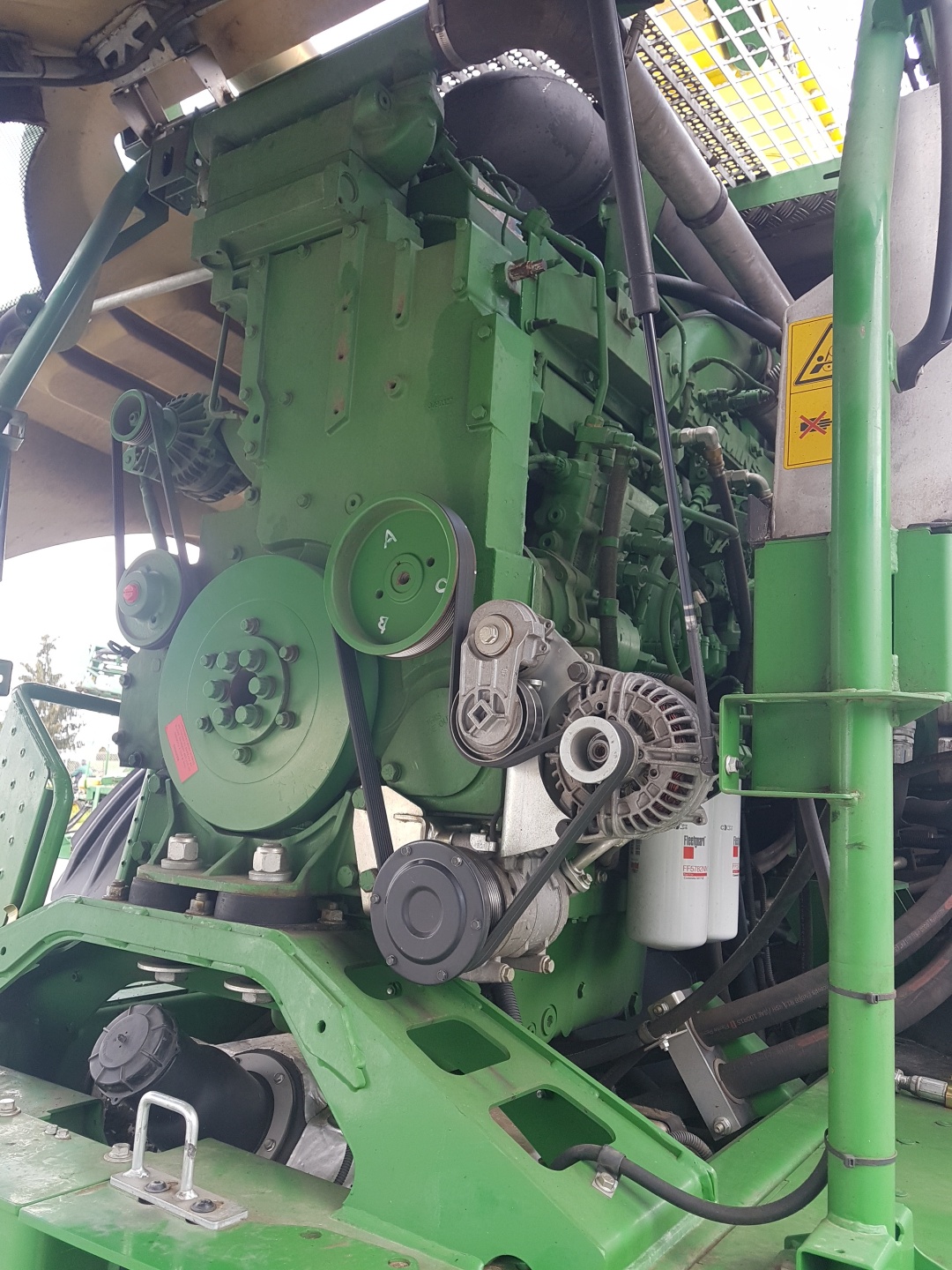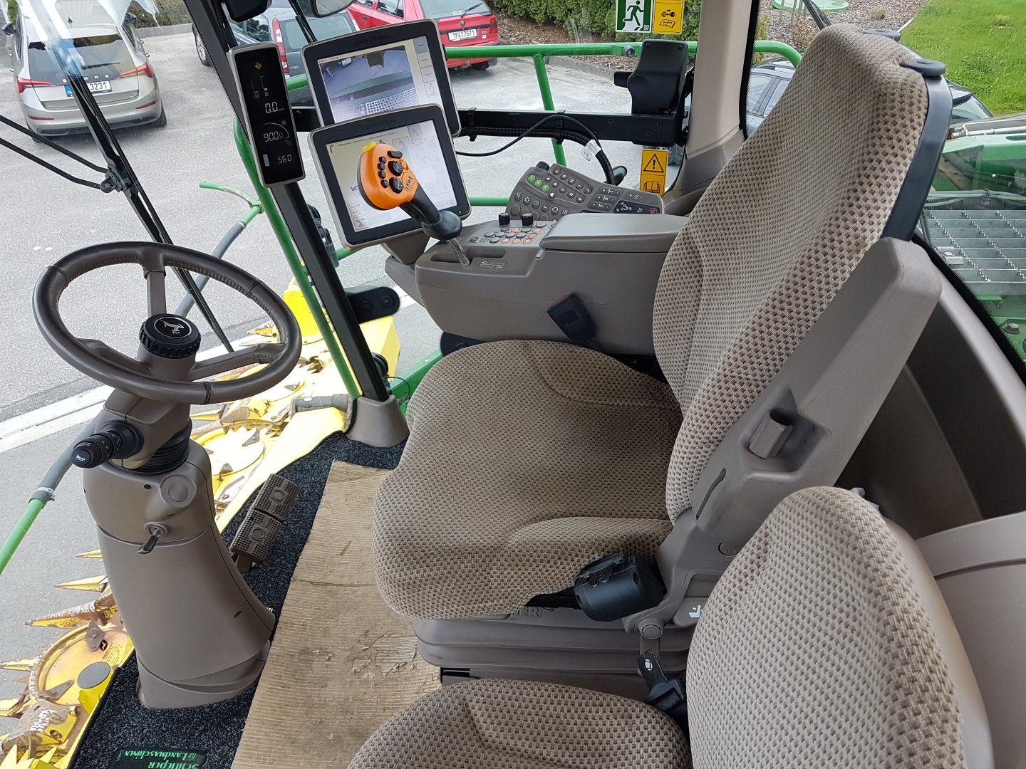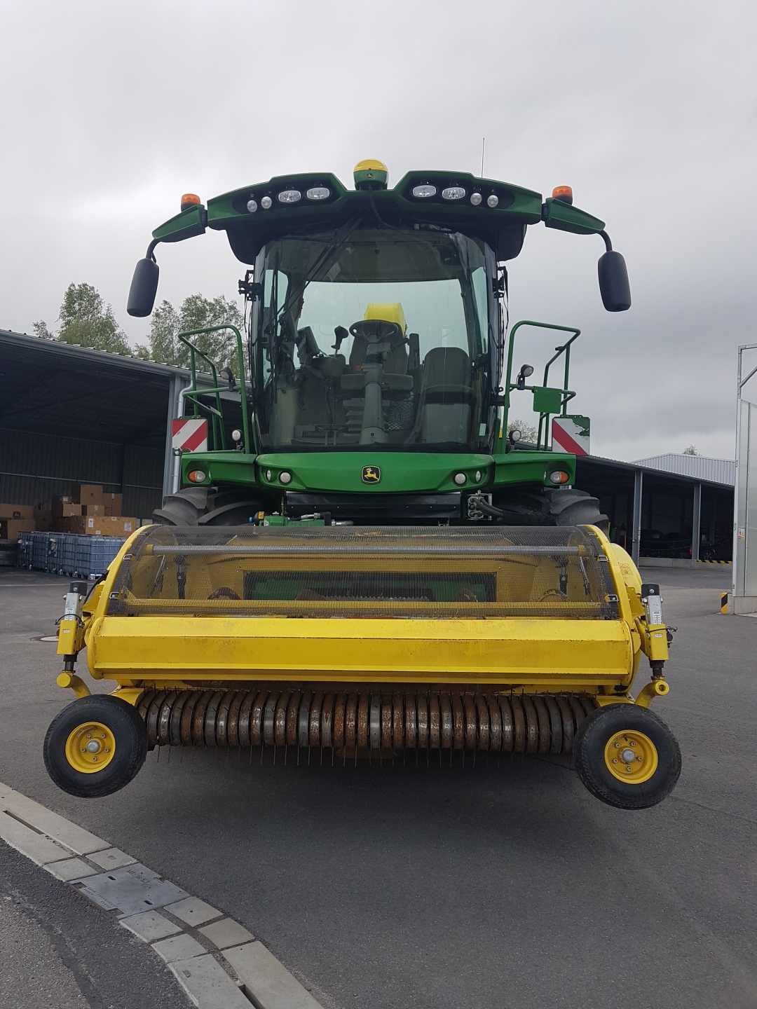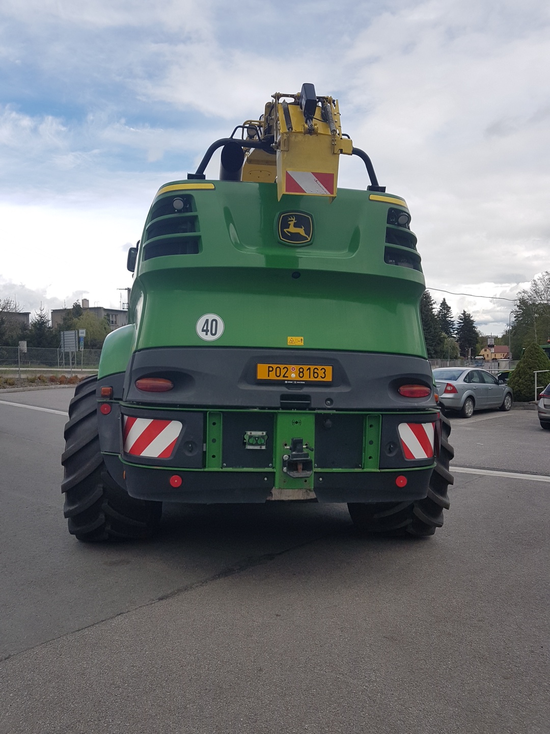 Rok výroby 2018, do provozu 3.5.2018, stav mth: motor/buben – 3538/2498 (po aktualizaci software zobrazuje stav mth buben 436), motor Cummins QSK19, výkon 843 PS – motor bez jakékoliv úpravy emisí ve výfuku (bez DOC, DPF, SCR), pohon 4x4, převodovka ProDrive 40 km/h, LED prac. osvětlení a majáky, buben 56 nožů – travní nože a travní protiostří, v příbalu sada použitých kukuřičných nožů, aktivní plnění odvozového prostředku, HarvestLab 3000, 2x display GS2630, automatické mazání, z výroby balíček Duraline ultimate, heavy duty zrnový procesor, premium sedačka řidiče, premium rádio, komplet AutoTrac - přijímač Starfire 6000/SF1 s aktivací, automatické připojení adaptérů, plná sada zadního protizávaží (12 ks), kožený volant, lednice, zadní kamera, systém detekce kamenů, jeřáb pro montáž/demontáž zrnového procesoru, prodloužení odhozového komína pro práci s kukuřičným adaptérem, zadní závěs pro přívěsy vč. okruhu hydrauliky, systém dávkování konzervantu – nádrž 360l, pneu 900/60R42 Michelin –50% vzorku, 750/65R26 Michelin – 50%, aktivovaný JD link