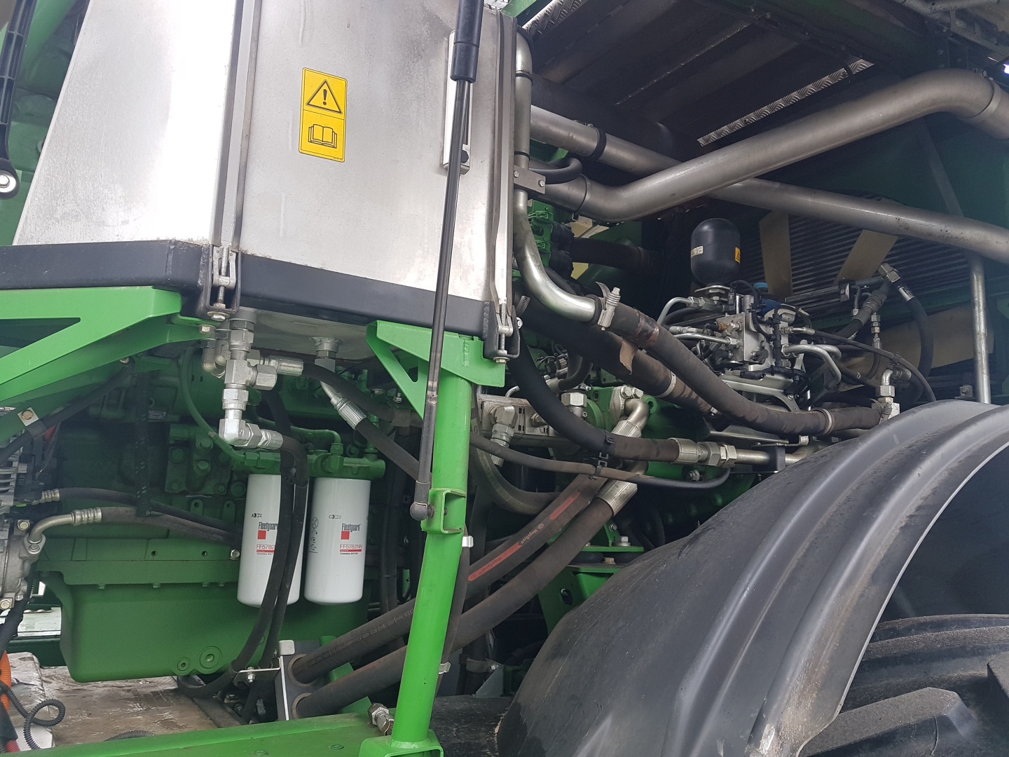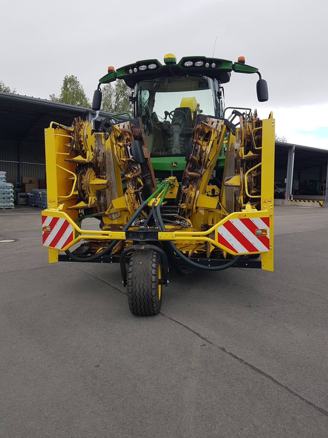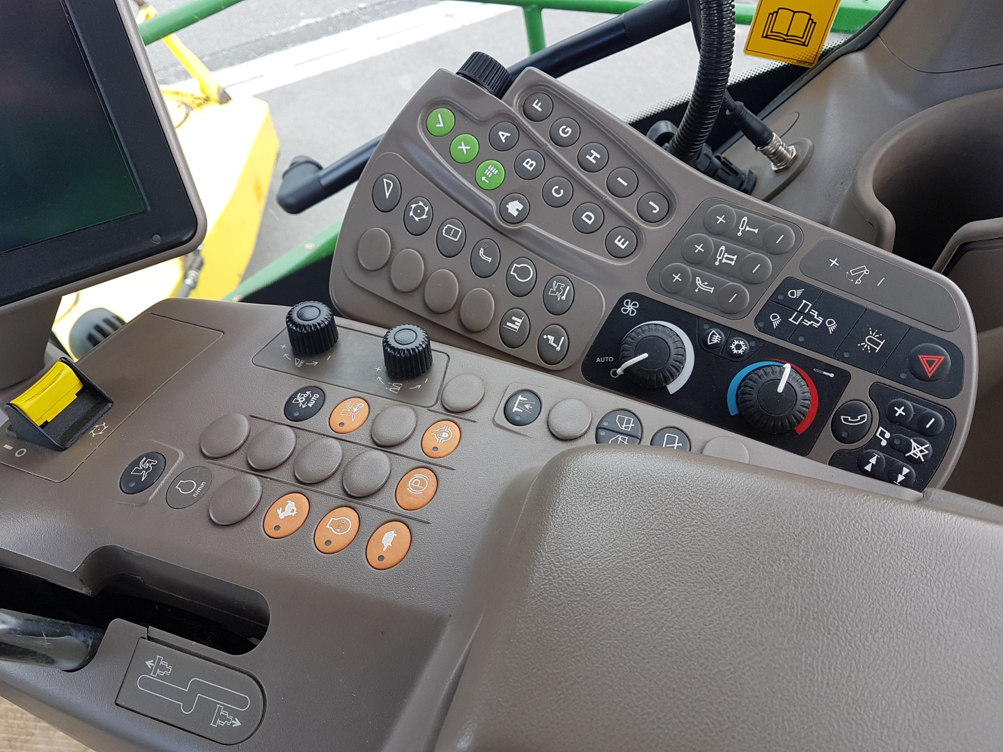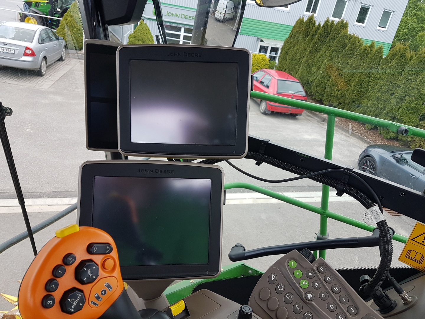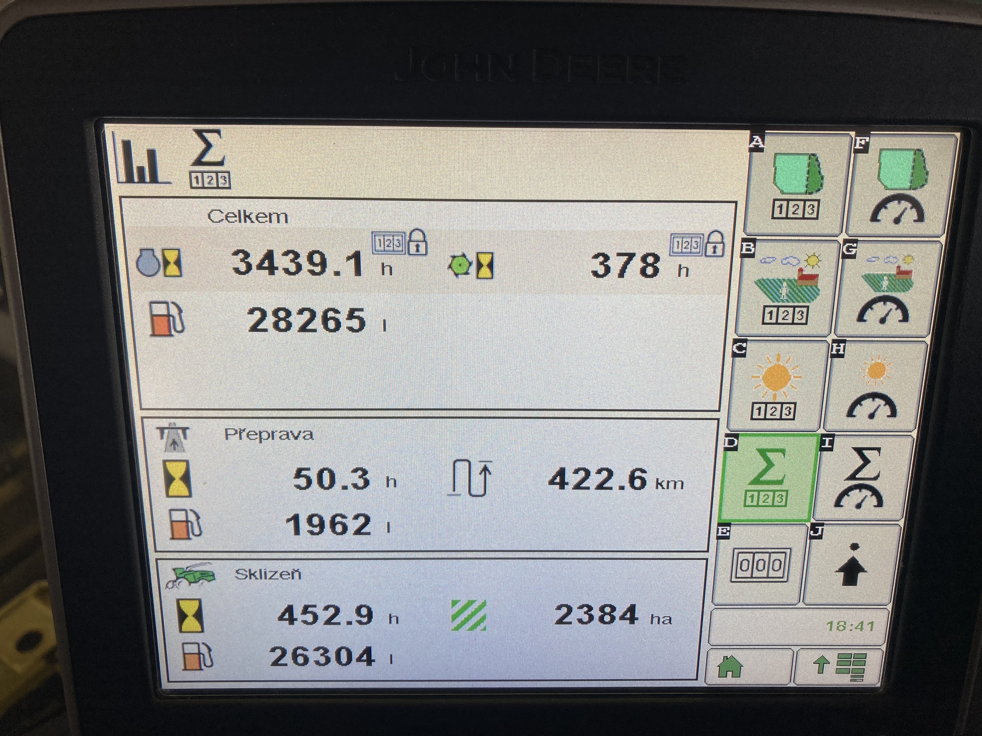 Rok výroby 2018, do provozu 3.5.2018, stav mth: motor/buben – 3538/2498 (po aktualizaci software zobrazuje stav mth buben 436), motor Cummins QSK19, výkon 843 PS – motor bez jakékoliv úpravy emisí ve výfuku (bez DOC, DPF, SCR), pohon 4x4, převodovka ProDrive 40 km/h, LED prac. osvětlení a majáky, buben 56 nožů – travní nože a travní protiostří, v příbalu sada použitých kukuřičných nožů, aktivní plnění odvozového prostředku, HarvestLab 3000, 2x display GS2630, automatické mazání, z výroby balíček Duraline ultimate, heavy duty zrnový procesor, premium sedačka řidiče, premium rádio, komplet AutoTrac - přijímač Starfire 6000/SF1 s aktivací, automatické připojení adaptérů, plná sada zadního protizávaží (12 ks), kožený volant, lednice, zadní kamera, systém detekce kamenů, jeřáb pro montáž/demontáž zrnového procesoru, prodloužení odhozového komína pro práci s kukuřičným adaptérem, zadní závěs pro přívěsy vč. okruhu hydrauliky, systém dávkování konzervantu – nádrž 360l, pneu 900/60R42 Michelin –50% vzorku, 750/65R26 Michelin – 50%, aktivovaný JD link
