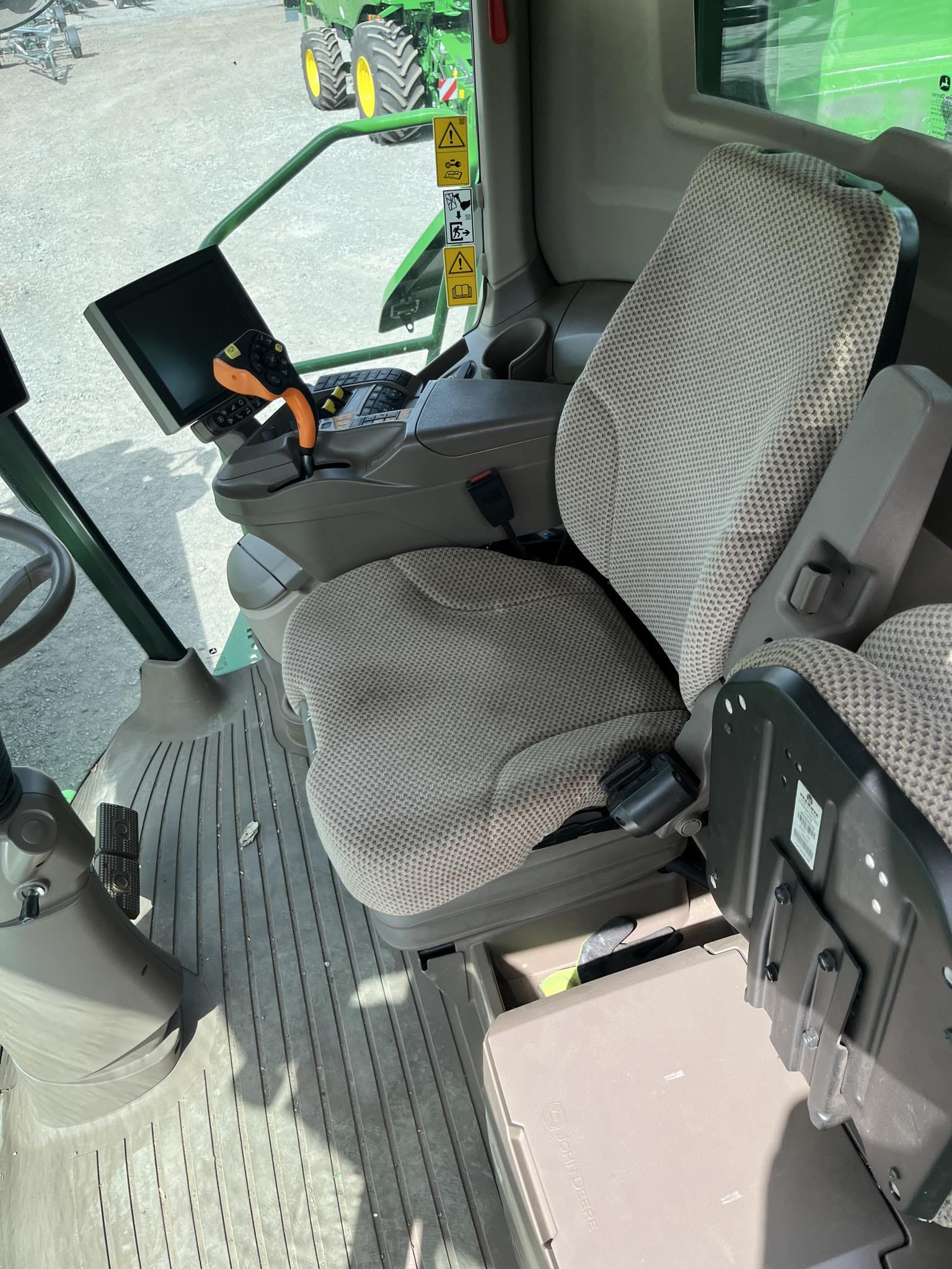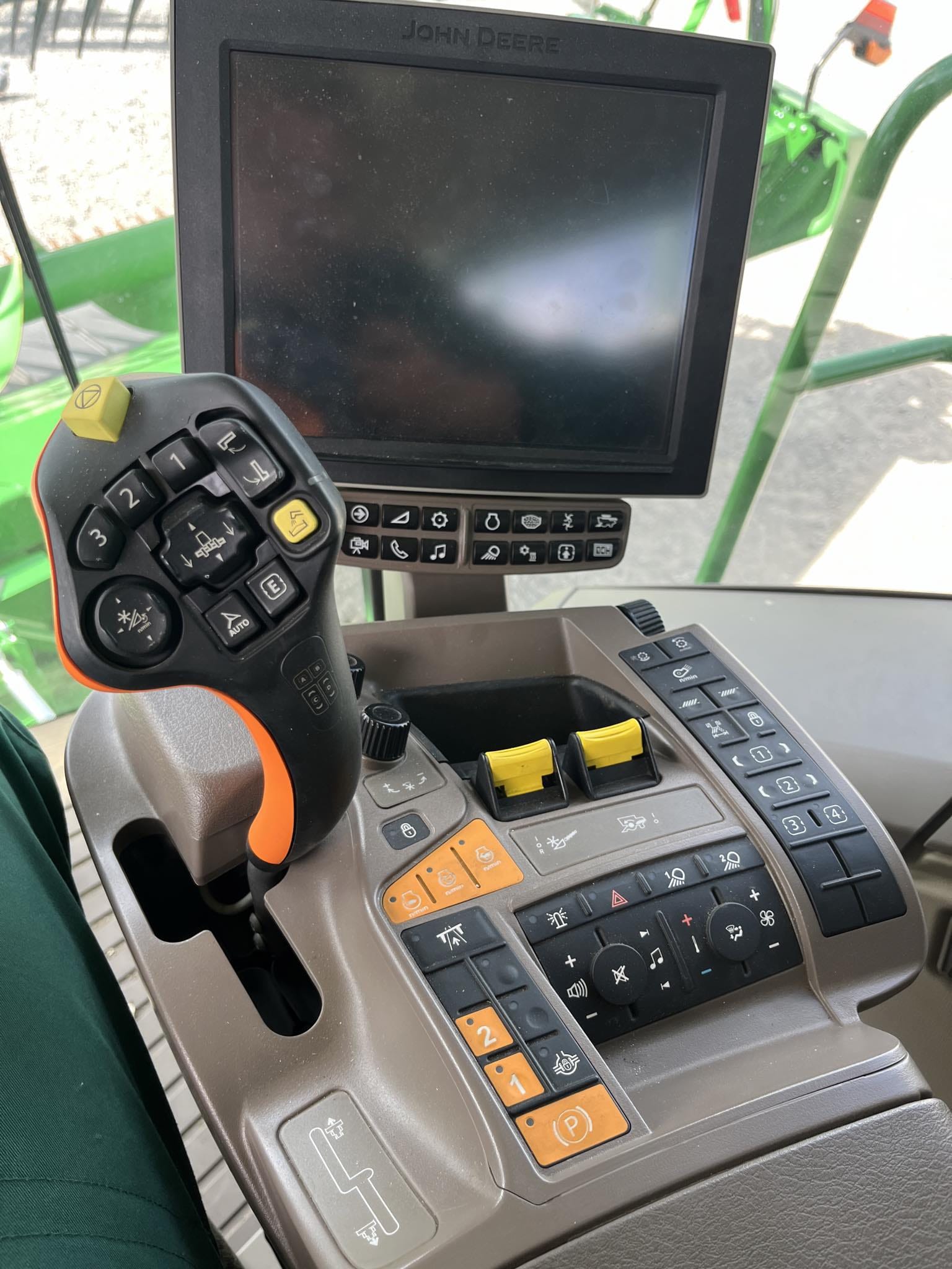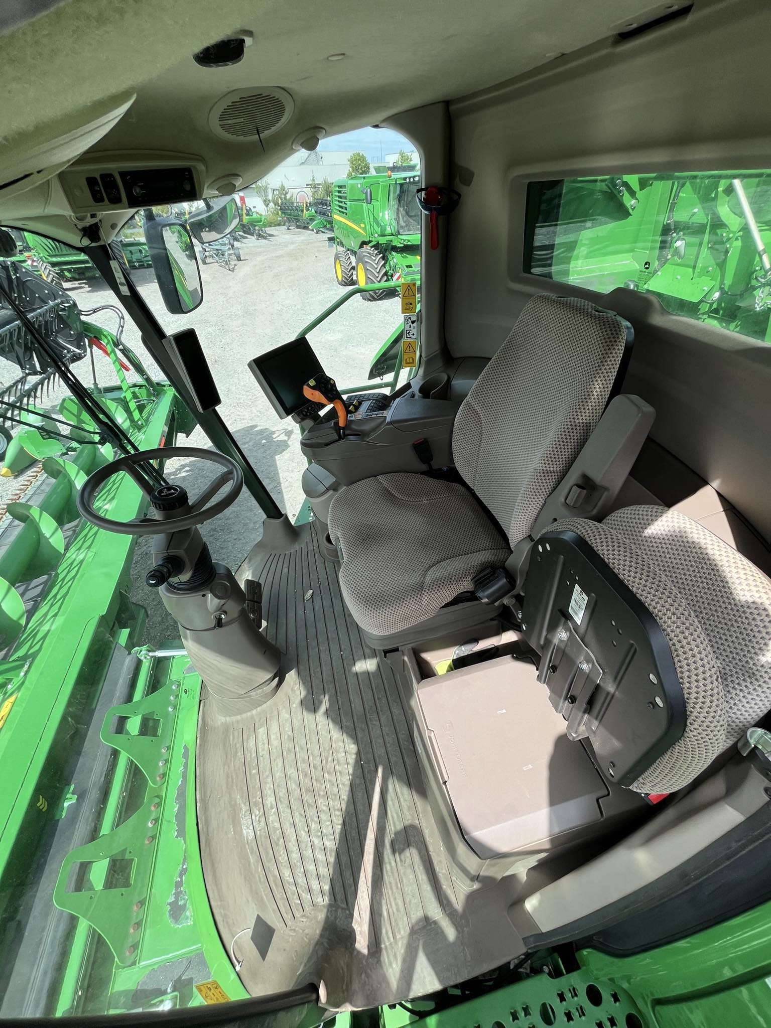 barevný 10" (26 cm) monitor GS4 4600 integrovaný v loketní opěrce pro kompletní ovládání a nastavování sklízecí mlátičky, plnohodnotnou funkci navigace, mapování výnosů a zobrazování informací o stroji i o sklizni; zcela nový rozměr individualizace nastavení a ovládání; 7 programovatelných tlačítek na pojezdové páce a loketní opěrce; informační monitor v pravém A sloupku pro zobrazení základních informací o stroji (otáčky motoru, rychlost, zařazený stupeň, zatížení motoru, teplota chladicí kapaliny, ukazatel hladiny paliva a DEF, množství omlatu, ztráty, úhel naklopení žacího válu...)