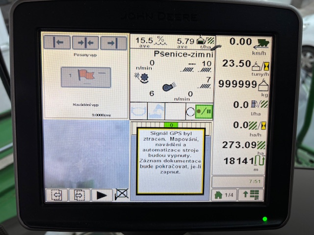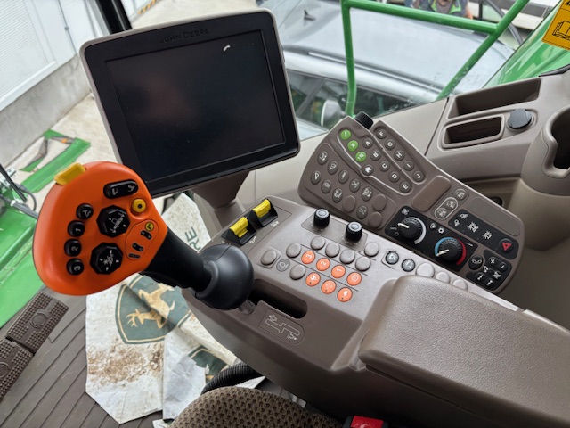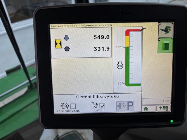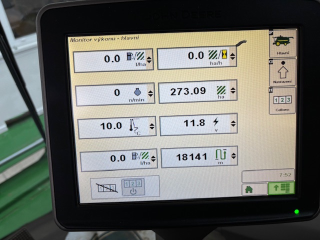 barevný 10" (26 cm) monitor GS3 2630 integrovaný v loketní opěrce pro kompletní ovládání a nastavování sklízecí mlátičky, plnohodnotnou funkci navigace, mapování výnosů a zobrazování informací o stroji i o sklizni; monitor lze při odstavení mlátičky vymontovat a používat jako displej navigace na jiném stroji John Deere a dalších; monitor v pravém A sloupku pro zobrazení základních informací o stroji (otáčky motoru, rychlost, zařazený stupeň, zatížení motoru, teplota chladicí kapaliny, ukazatel hladiny paliva a DEF, množství omlatu, ztráty, úhel naklopení žacího válu...)