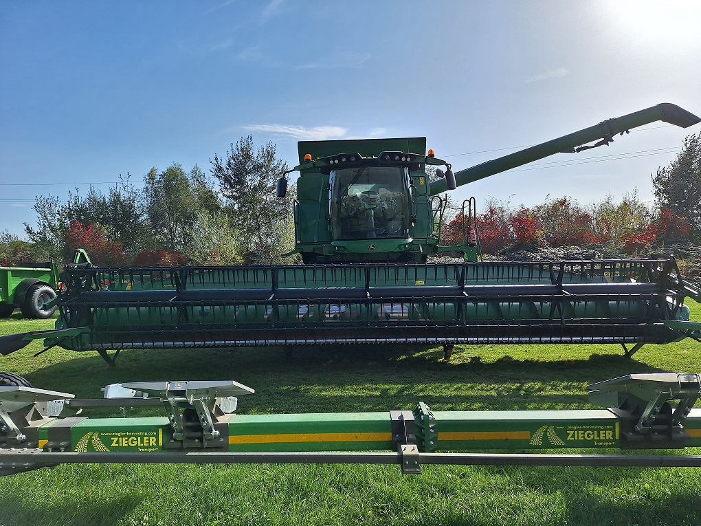 robustní podvozek ZIEGLER POWER; určeno pro lištu řady 700X o záběru 9,15 m; obě nápravy jsou řiditelné - mechanická synchronizace; podvozek kopíruje stopu kombajnu bez nutnosti nadjíždění; verze 25 km/hod