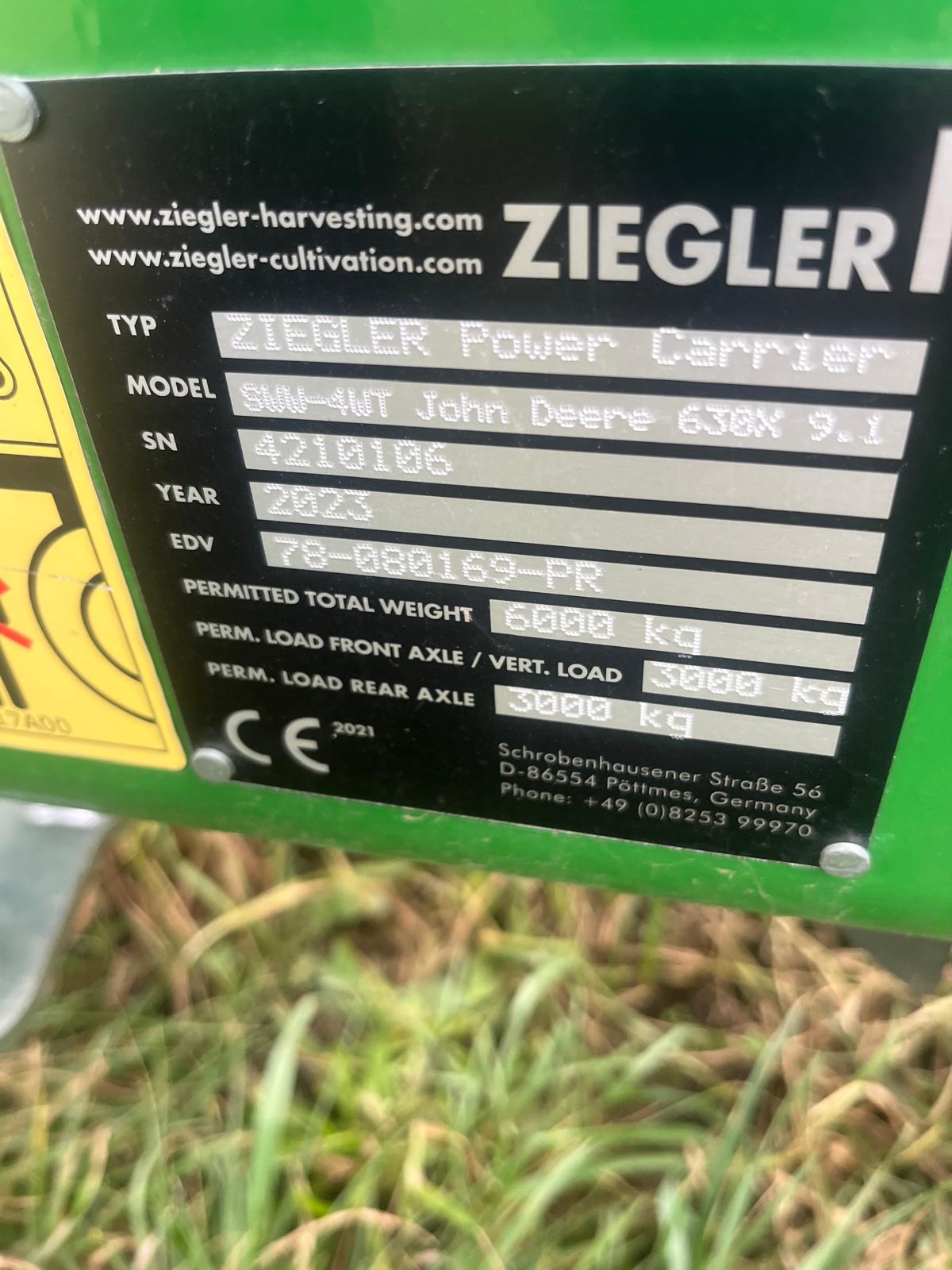 robustní podvozek ZIEGLER POWER; určeno pro lištu řady 700X o záběru 9,15 m; obě nápravy jsou řiditelné - mechanická synchronizace; podvozek kopíruje stopu kombajnu bez nutnosti nadjíždění; verze 25 km/hod