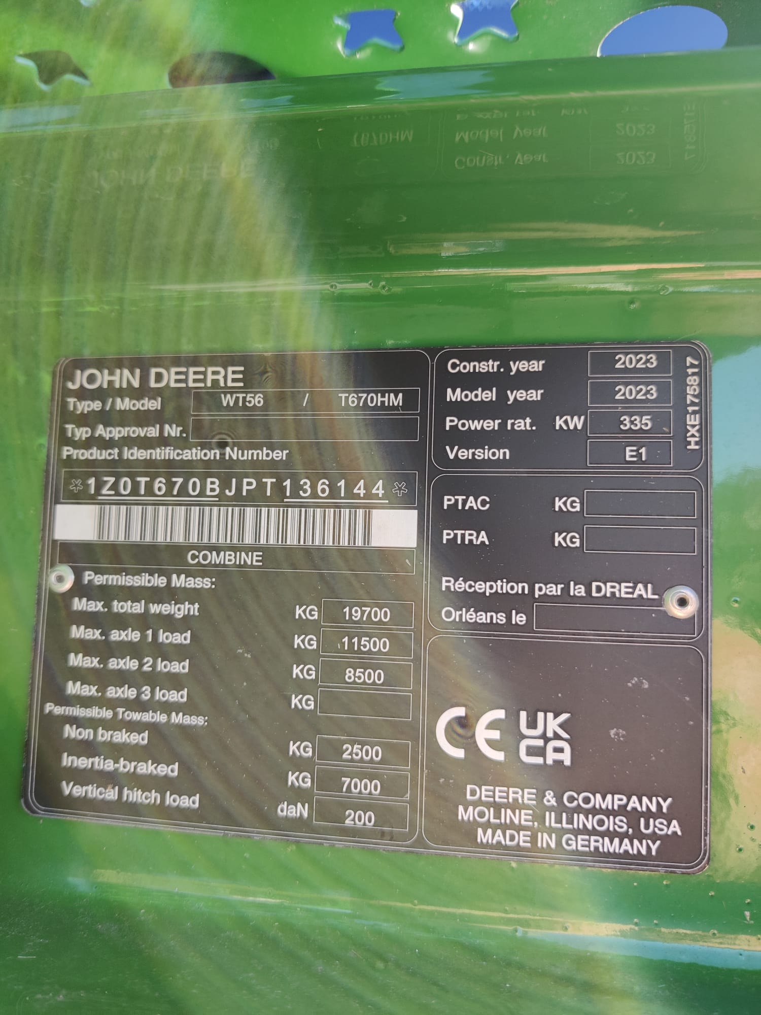 Výrobní číslo mlátičky John Deere T670HM: 1Z0T670BJPT136144