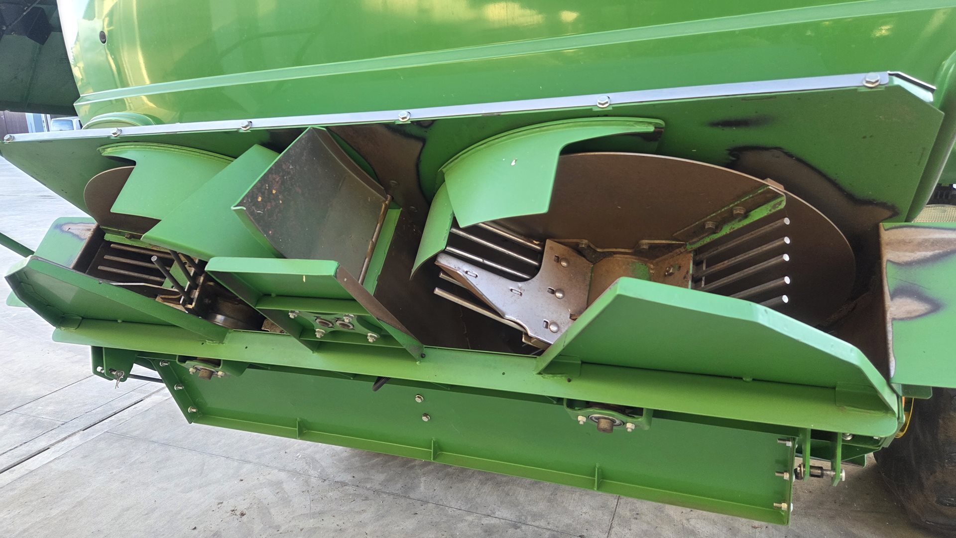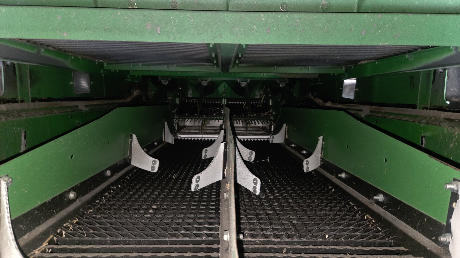 | spádová deska s usměrňovacími plechy; vynášecí šneky dopravující materiál na předčištění bez ohledu na jakýkoli náklon stroje a vždy rovnoměrně; systém rozprostírání materiálu po horním sítu |