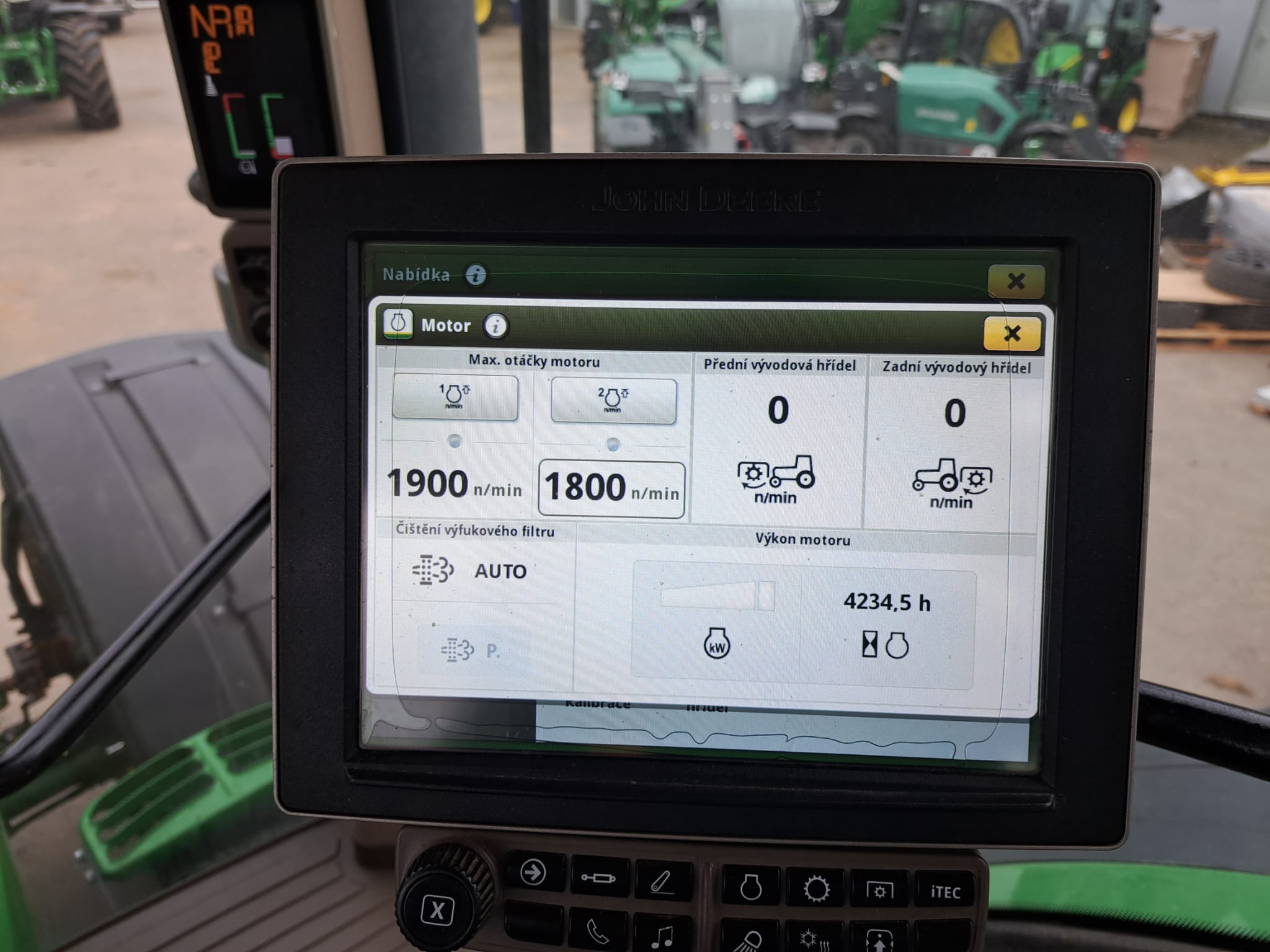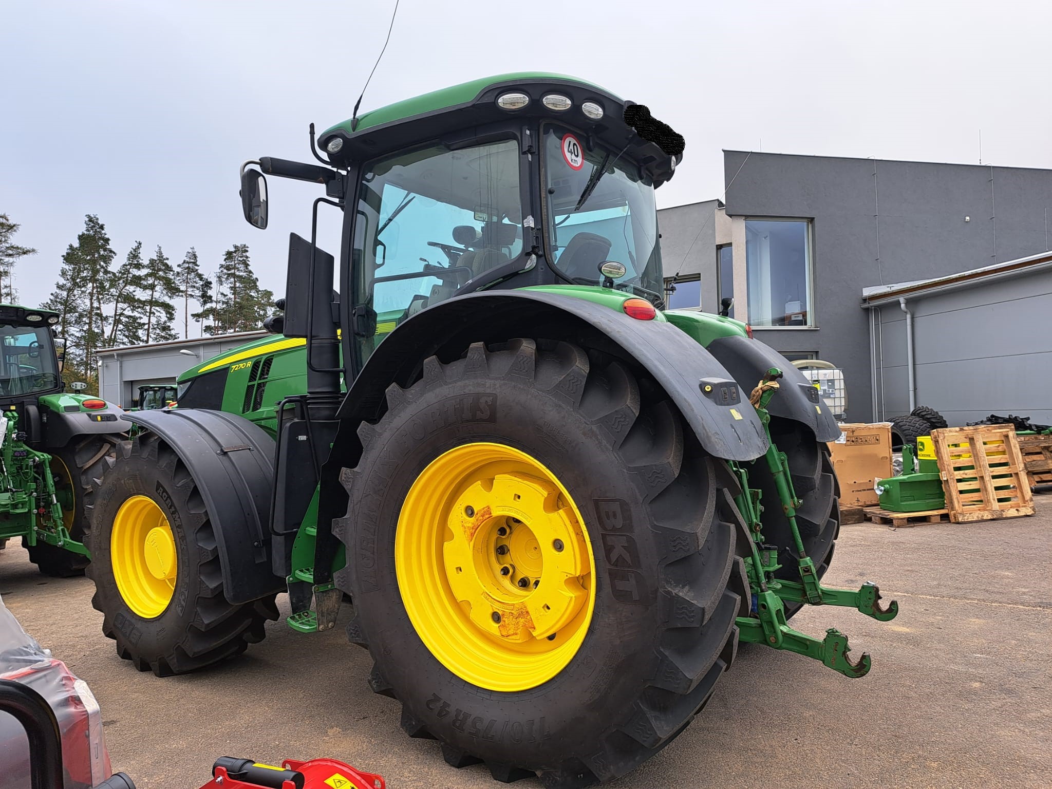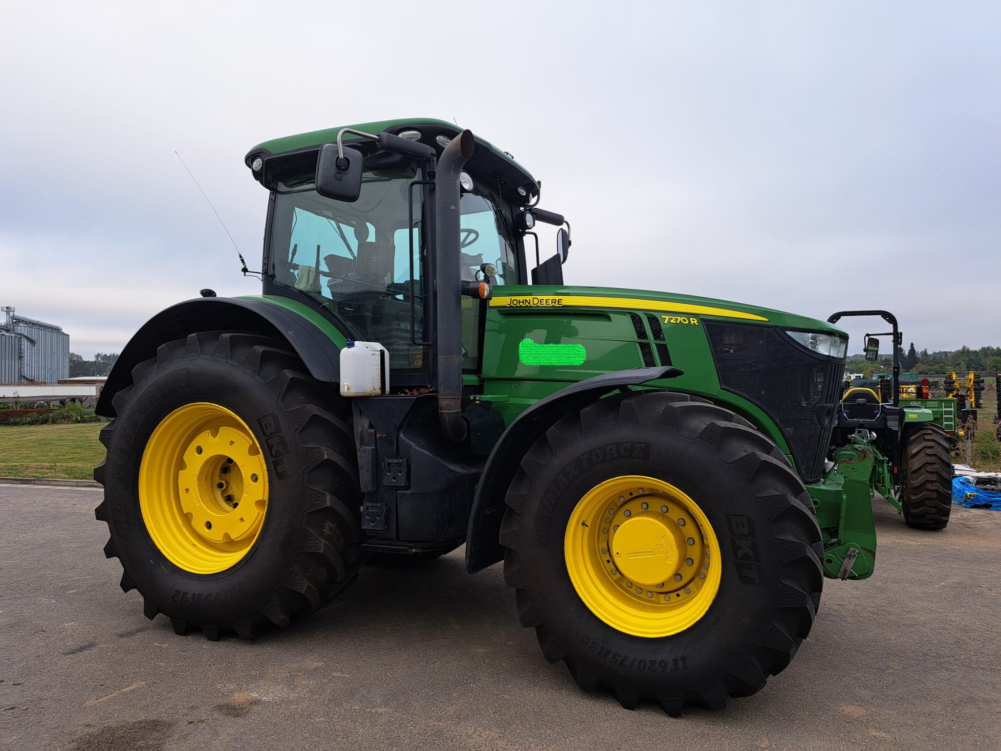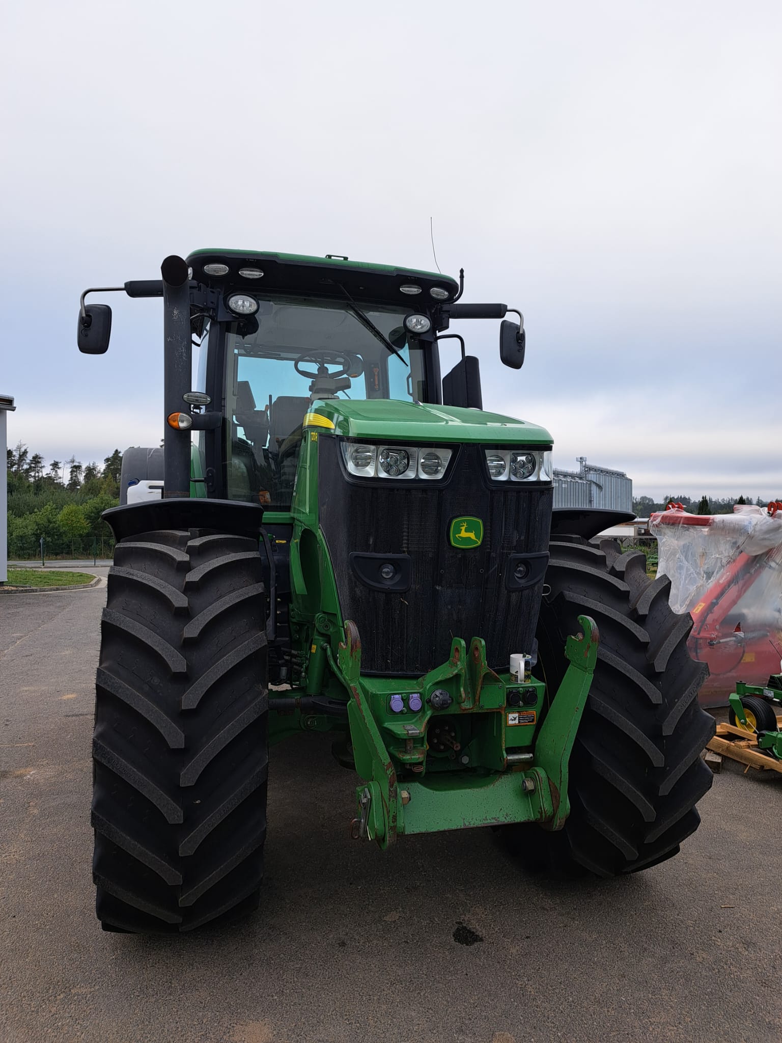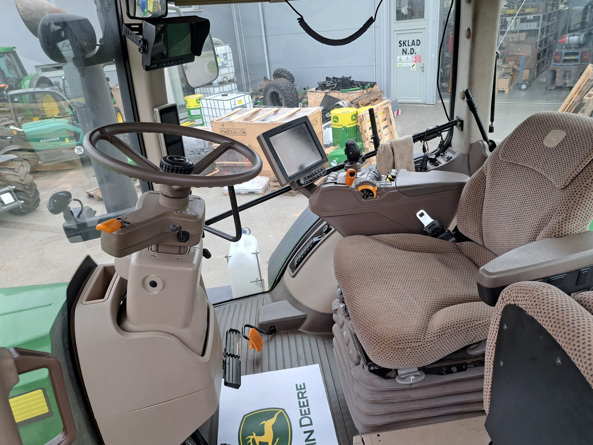 Traktor JOHN DEERE 7270R, Rok výroby 2015, do provozu 2016, jmenovitý výkon motoru 270 PS (chip od X tuning na 300PS), najeto 4260 Mth, motor - objem 9,0l BEZ ADBLUE, plynulá převodovka Autopower, PNEUMATIKY NOVÉ - přední 620/75 R30 - 100% vzorku, zadní 710/70R42 - 100%, rychlost 50 km/h, výškově stavitelný závěs s automatickou hubicí + K80, vzduchové brzdy, odpružená kabina a odpružená přední náprava s brzdami, originální lednička v kabině, automatická klimatizace, elektricky stavitelná zrcátka, 5 hydraulických okruhů + el. joystick pro ovládání středových okruhů, powerbeyond, volná zpátečka, PTO 540E/1000E/1000 ot/min, Autotrack příprava + aktivace, aktivovaný JD link, vrtule chladiče CLEAN FIX, čelní ramena s vývodovým hřídelem, hydraulický třetí bod, LED pracovní osvětlení.